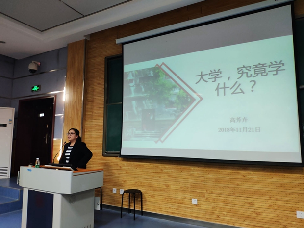2018级本科生入校已经近三个月,为了让同学们时刻保持上进心态,正确了解自我,认识大学,保持端正的学习态度。11月21日下午16:30,best365官方网站登录入口分党委秘书、团委书记、2015级辅导员高芳卉老师,在5204教室为2018级本科新生开展第六次入学教育报告会,主题为:“大学,究竟学什么?”。