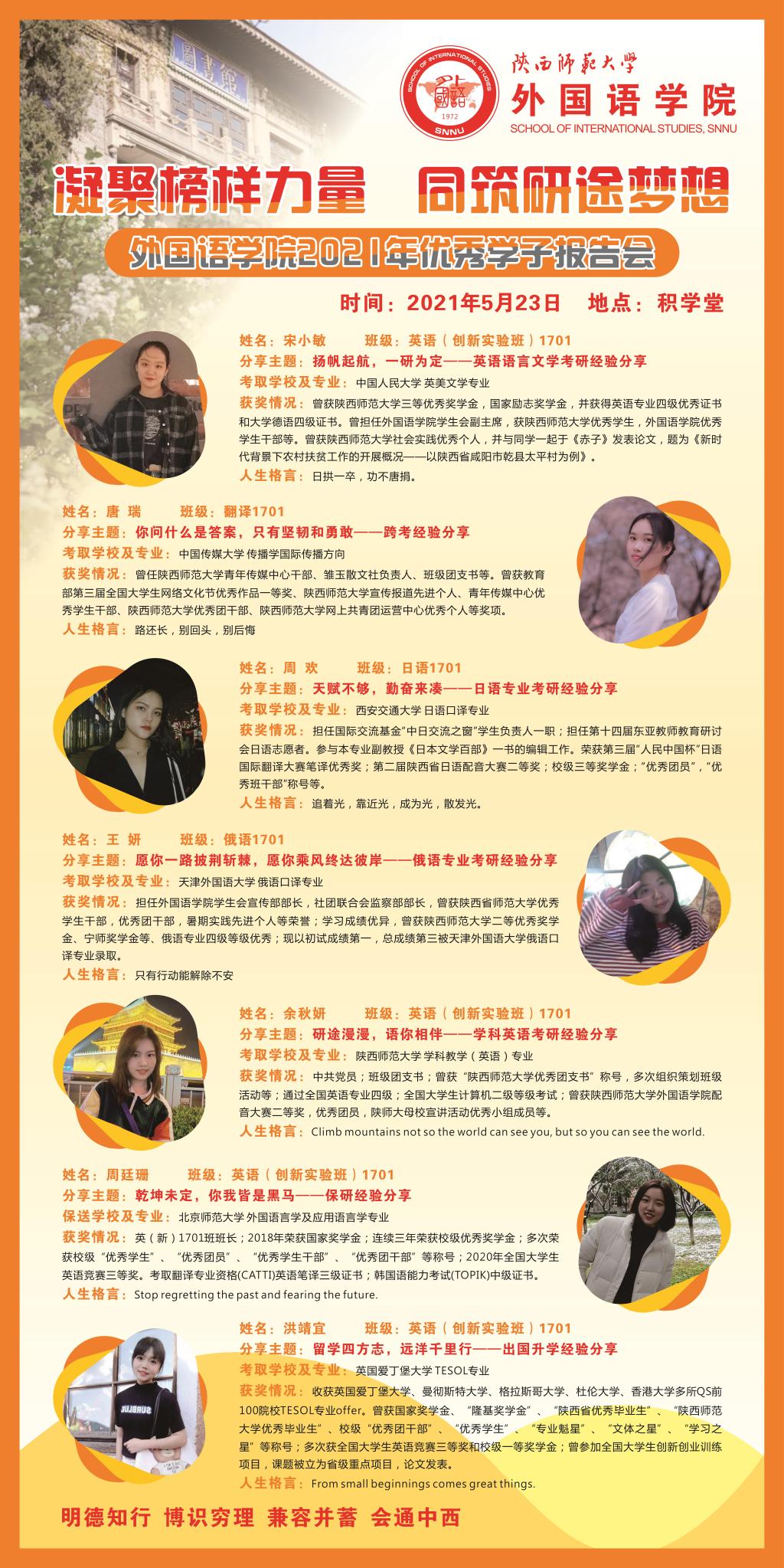 英创1701班宋小敏同学以“扬帆起航,一研为定”为主题回顾了自己的考研过程,建议同学们保持良好心态,制定相关计划;翻译1701班唐瑞同学以“你问什么是答案,只有坚韧和勇敢”为主题分享了自己的大学四年期间以及最后决定跨专业考研的心路历程,鼓励同学们要敢去想,敢去试,勇于拼搏;日语1701班周欢同学以“天赋不够,勤奋来凑”为主题就要不要考研、如何择校、考研时间安排等问题进行了解答,并针对各科复习要点向大家推荐了一些学习资源,希望大家都能到达想去的地方;俄语1701班王妍同学以“愿你一路披荆斩棘,愿你乘风终达彼岸”为主题分享了自己的考研过程以及初复试经验,还分析了近年考研的趋势,她希望同学们能够不负青春,努力奋斗,勇敢追梦;英创1701班余秋妍同学以“研途漫漫,语你相伴”为主题分享了自己的择校经验与时间安排,为同学们的时间规划提供了诸多建议,并向同学们说明了考研容易出现的心态问题以及解决方法;英创1701班周廷珊同学以“乾坤未定,你我皆是黑马”为主题介绍了保研的条件以及前期准备,分析了不同的保研方式,同时分享了自己参加不同学校口试及面试的经验,建议大家提前做好准备,不要过度焦虑;英创1701班洪靖宜同学以“留学四方志,远洋万里行”为主题,为同学们解答了出国留学的相关问题,分享了自己的留学经验。