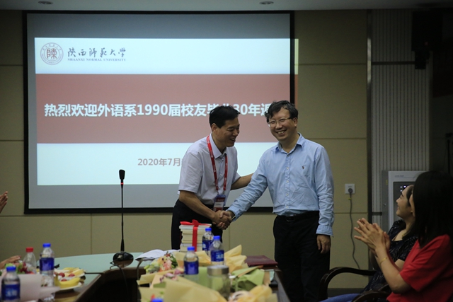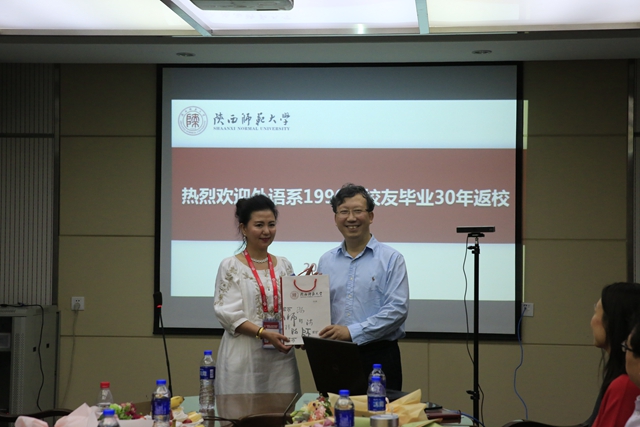 最后,学院向校友们赠送了纪念品——致外语系九零届毕业生的一封信、印有校友们姓名的定制印章、印有师大校训的折扇。王启龙院长代表学院接受了本届校友们的著作书籍,座谈会在师生热烈的掌声中圆满结束。