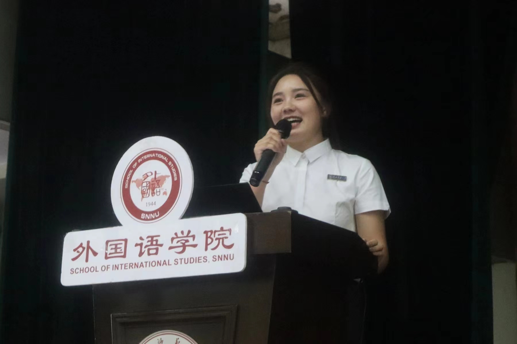 研究生在校代表2023级笔译班陈昭蓉发言。她特别强调了导师在研究生阶段教育中的核心地位,鼓励每位新生都要珍惜与导师相处的机会,积极主动地向导师请教。勉励大家要有勇气面对一切未知与挑战,始终保持乐观的态度。