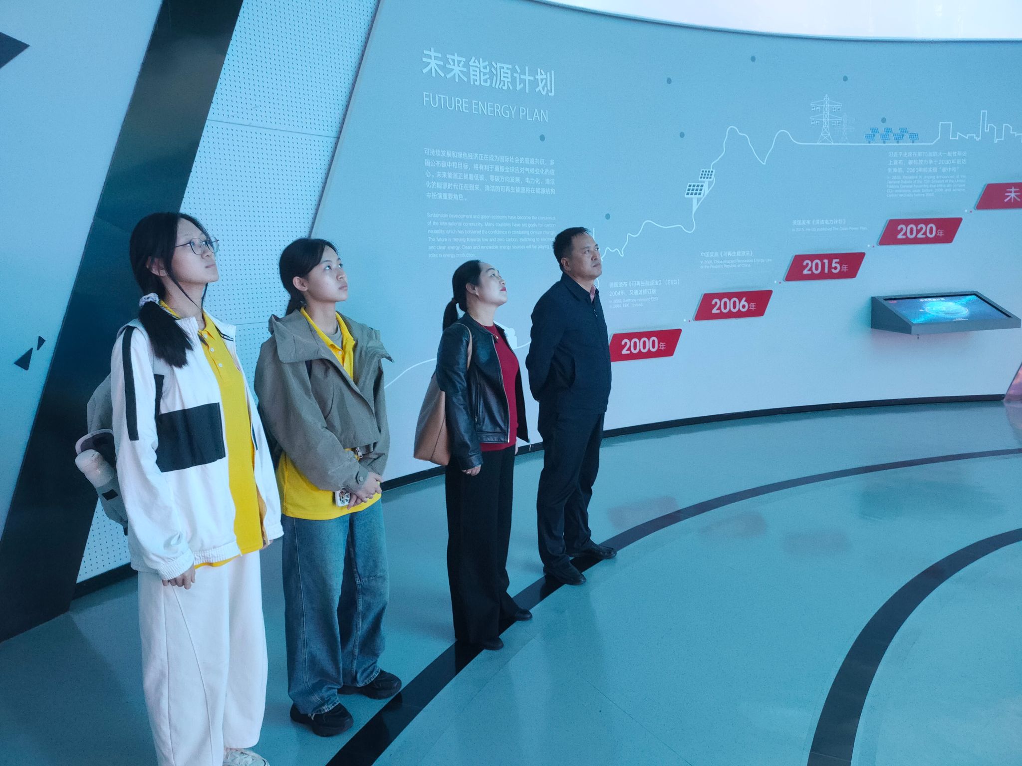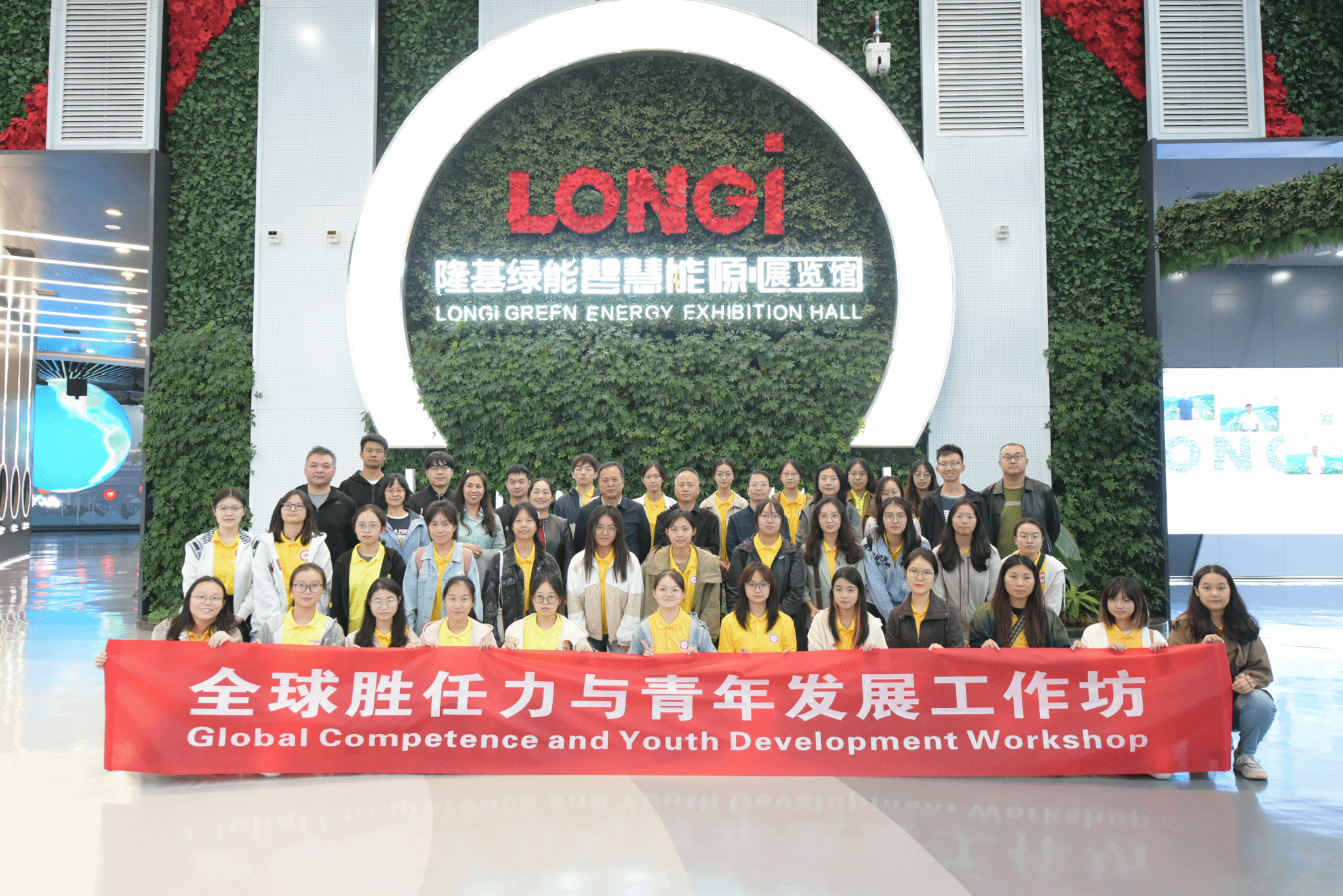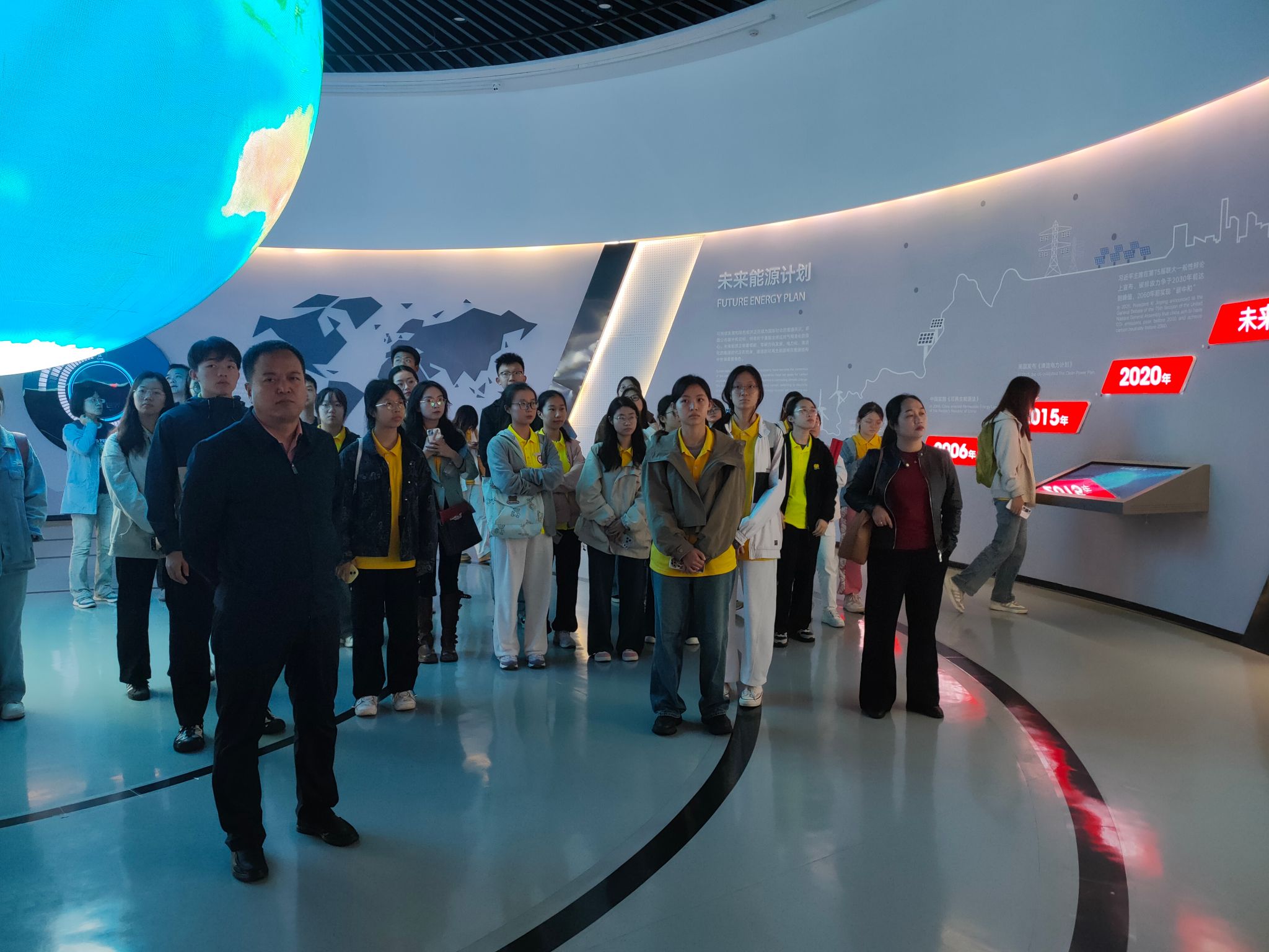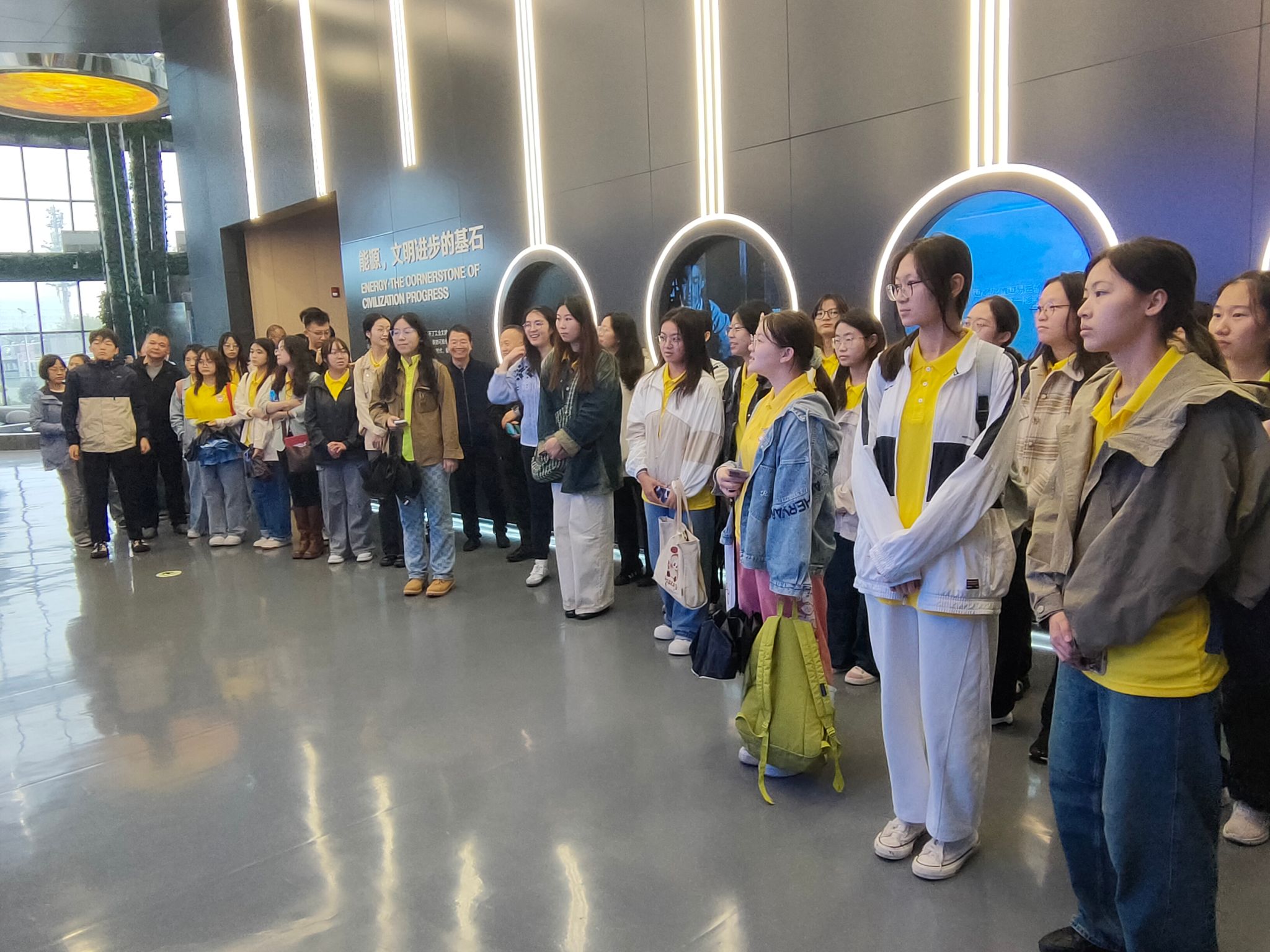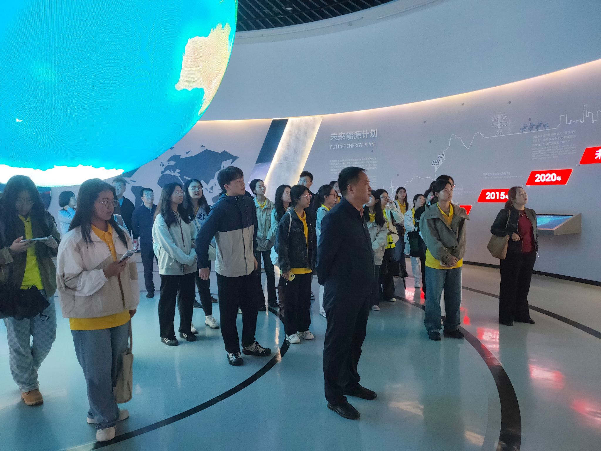 师生们首先参观了隆基绿能智慧能源展览馆。通过先进的多媒体互动技术,讲解员向师生们全面展示了清洁能源尤其是光伏和氢能在全球中的应用,并重点介绍了隆基绿能在新能源领域的发展历程、科技创新成果及未来战略规划。师生们进一步增进了对隆基绿能的企业价值、全球光伏产业现状、绿色能源转型等方面的了解。