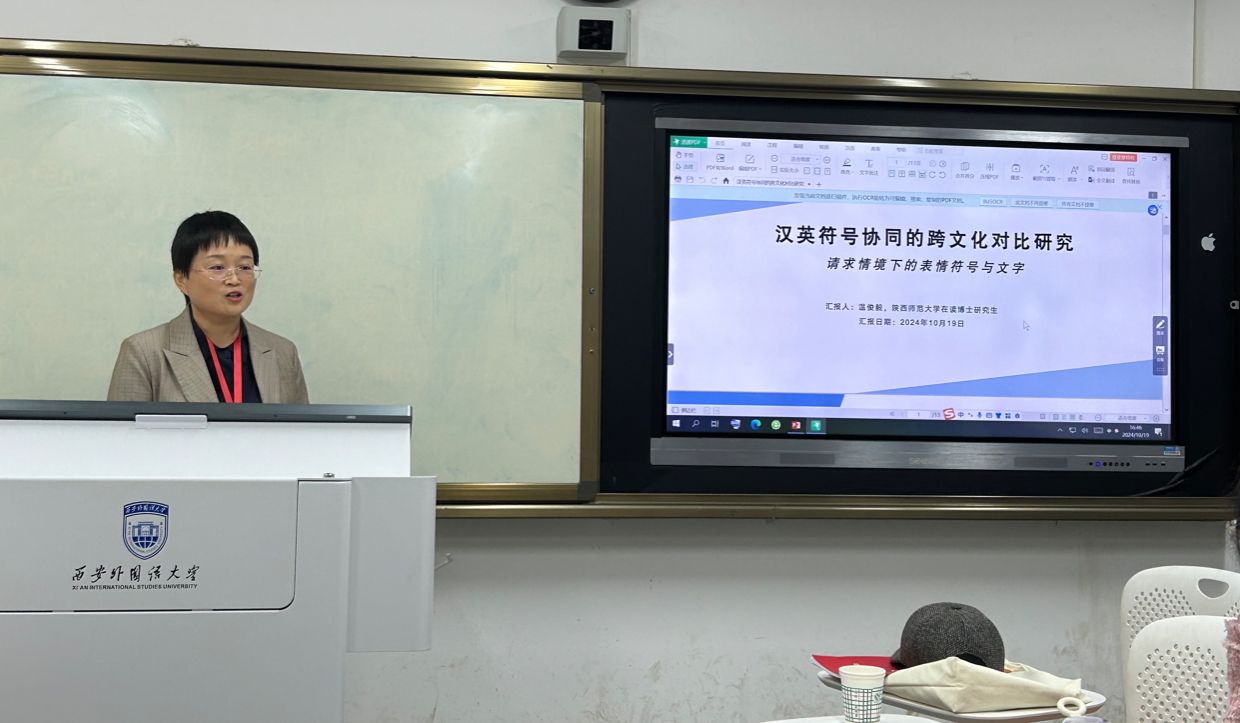 温俊毅的发言题目为“汉英符号协同的跨文化对比研究:请求语境下的表情符号与文字”,对比了中英文社交媒体中“请求”情境下的符号协同,结合符号学、跨文化传播和多模态符号系统理论,揭示了符号协同的文化差异,为跨文化沟通提供了新视角。