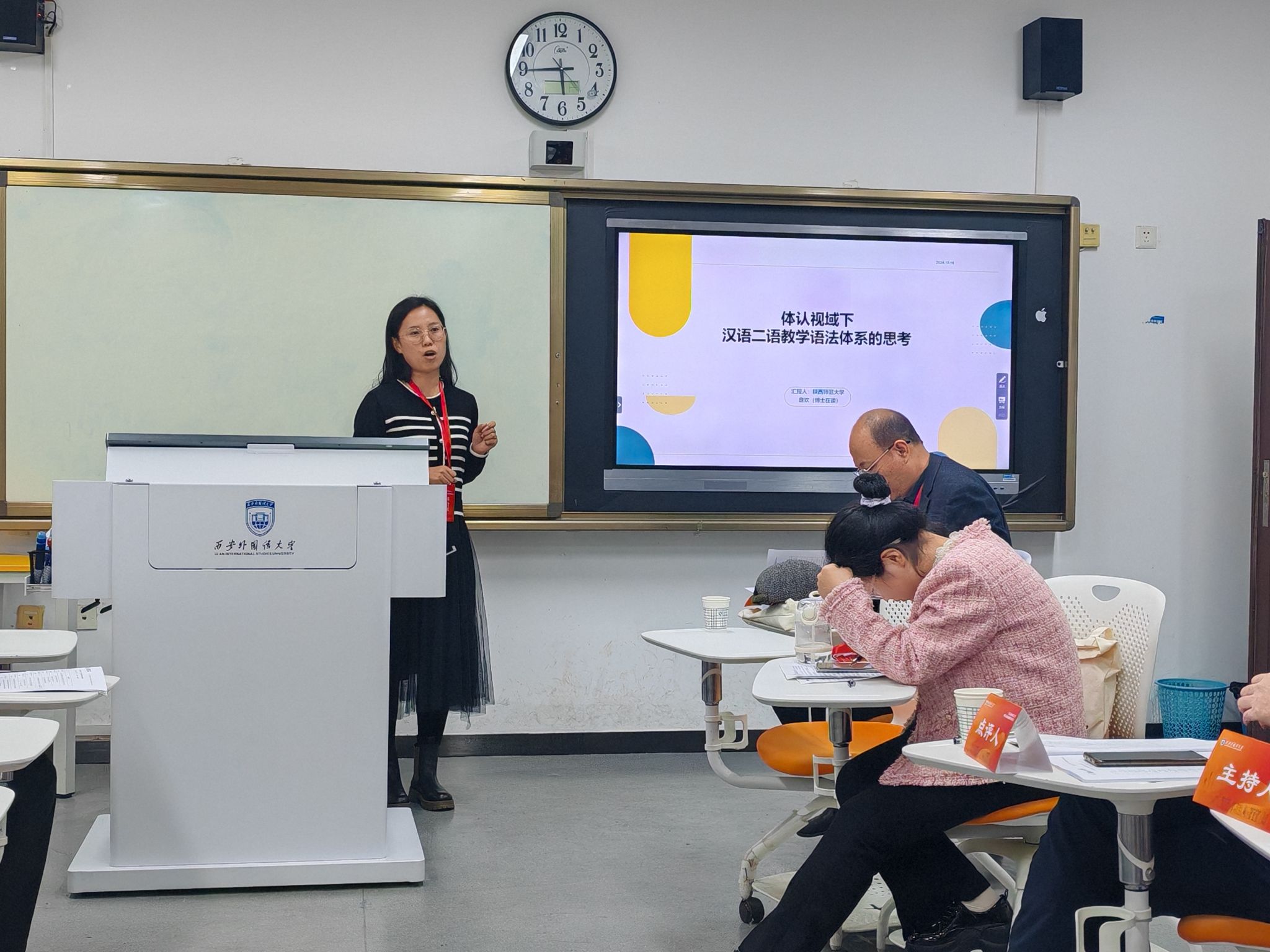 庞欢的发言题目为“体认视域下的汉语二语教学语法体系的思考”,以体认语言学为基础,“体认式”教学思想为核心,对汉语二语教学语法进行了思考。从体认的角度阐述了教学语法项目的解释、偏误分析与教学建议。