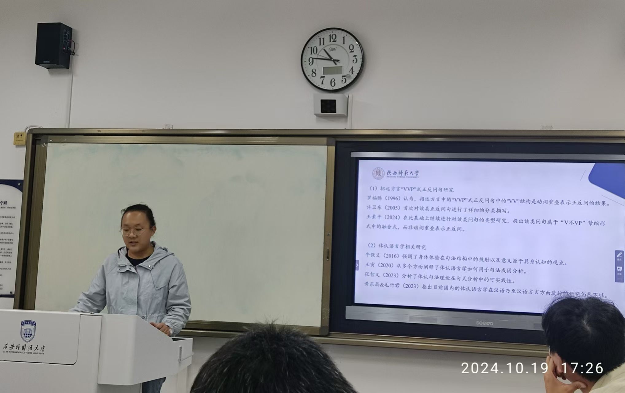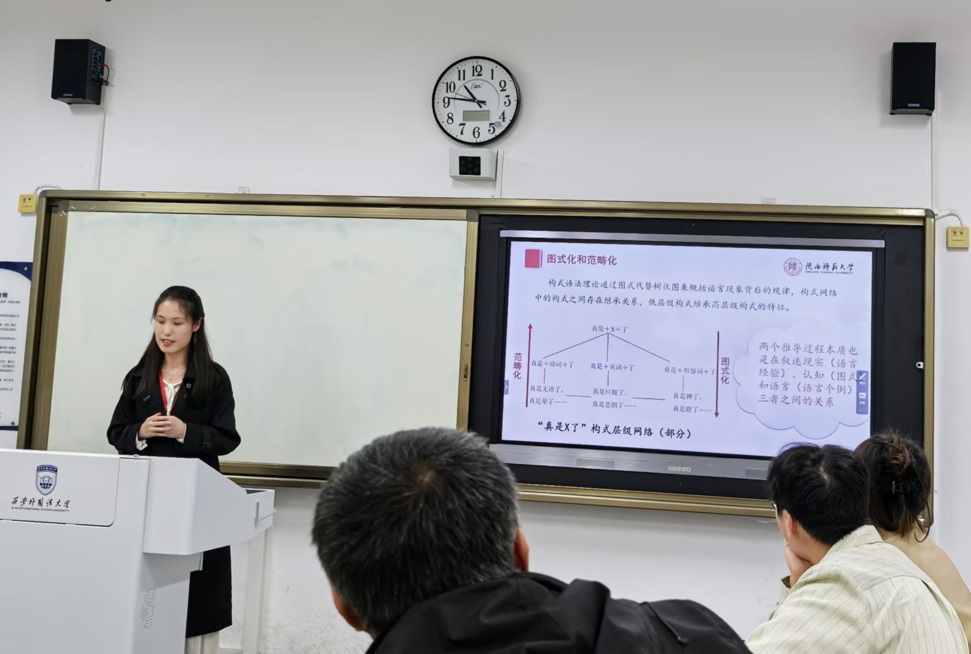 秦艺潇做了题为“‘真是X了’构式的体认语言学研究”的发言,用体认语言学的核心原则重新探究了网络流行语“真是X了”构式的认知基础、构式特征,语义特征、语用功能及其背后的文化心理机制,阐述了其体认性、构式观、动态性和过程性。