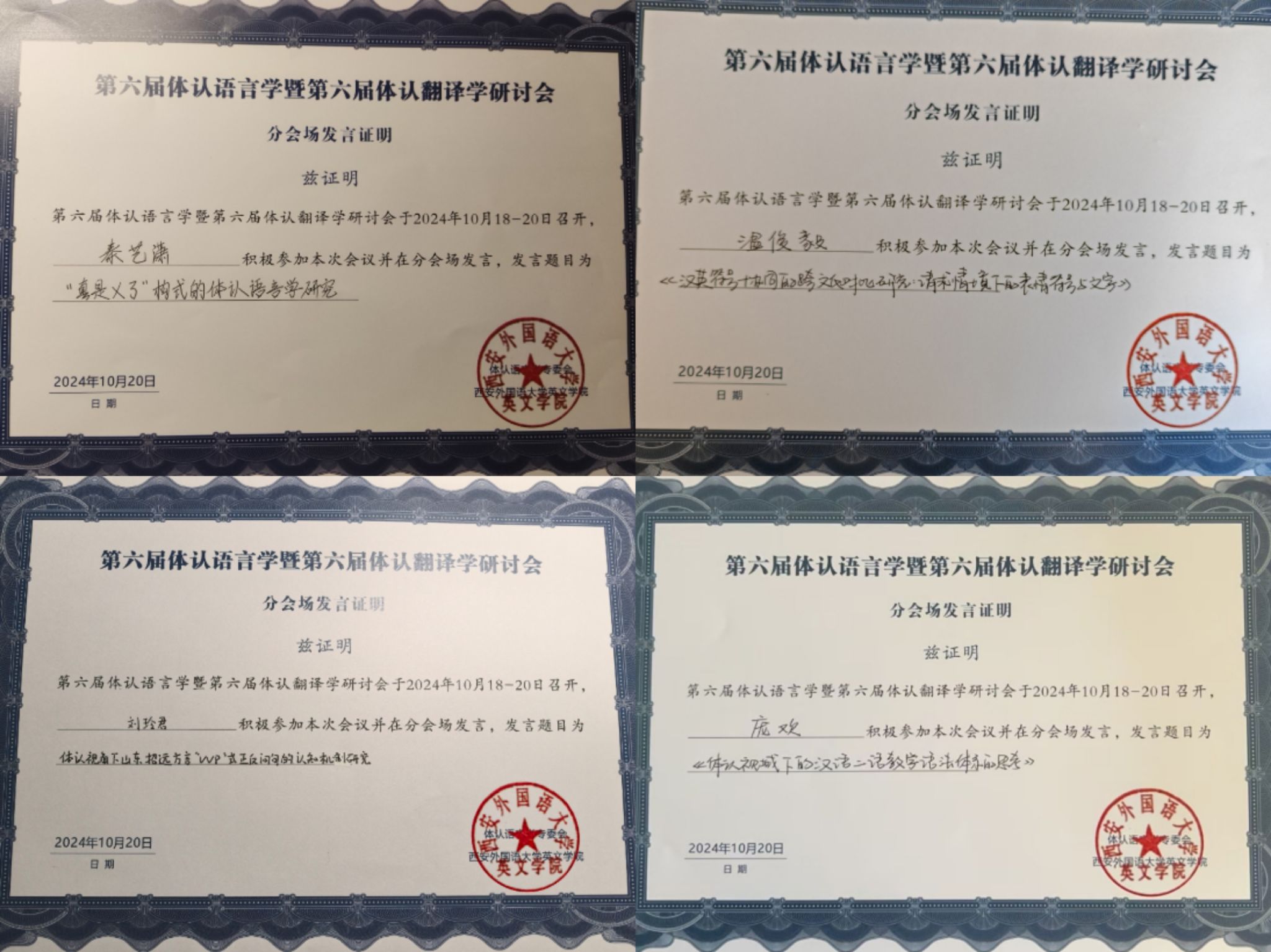 2024年10月18至20日,第六届体认语言学暨第六届体认翻译学研讨会在陕西西安成功举行。本次大会由体认语言学专委会主办,西安外国语大学英文学院、四川外国语大学中外文化比较研究中心和外语教学与研究出版社承办,多家学术期刊协办。来自国内外多所高校的170余名专家学者和青年学生参加了本次会议。大会历时一天半,共举办了21场专家主旨发言、6场分会场发言和1场主编论坛。