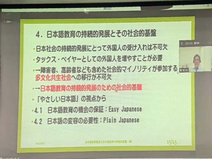 日本一桥大学庵功雄教授以《日本語教師の育成と日本語教育の持続的発展》为题,深入分析了日本国内外籍居民数量增长及日语教育制度变革的现状,全面概述了近年来日本国内日语教育政策的实施进展,从“简单日语”(Easy Japanese)和“简明日语”(Plain Japanese)两大层面详细阐述了支撑日本社会日语教育持续稳健发展的基础框架,强调针对不同受众群体应采取差异化的日语教育策略。庵功雄教授指出,“简单日语”是确保广泛日语教育机会的关键所在,“简明日语”是推动日语转型的必要条件,并进一步表示在日语教师培养过程中,应着重于“恢复语言教育的本质”以及“培养具有多样性包容性的领导者”,以期在多文化共生的社会中,推动日语教育的持续发展。