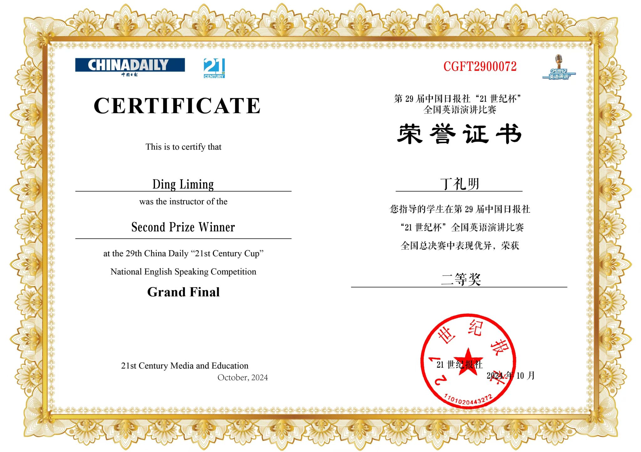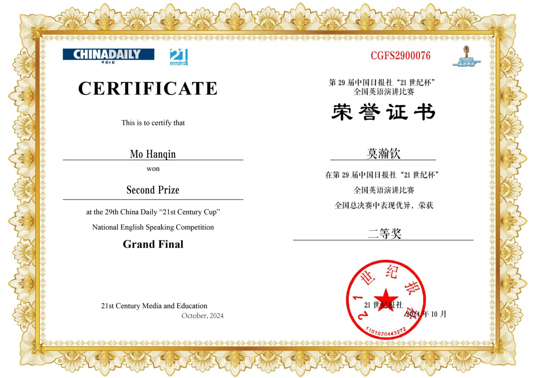 2024年10月17日至10月21日,由中国日报社、21世纪英语教育传媒承办的第29届中国日报社“21世纪杯”全国大学生英语演讲比赛全国赛在江苏无锡落下帷幕。全国总决赛共有来自各个省级赛区的246名选手。在经过5天、三轮的激烈比拼后,best365官方网站登录入口英语系2023级英语师范专业莫瀚钦同学获得全国二等奖,best365官方网站登录入口英语系丁礼明老师获得优秀指导教师奖。此次获奖也是大学生TOP外语成长训练营的阶段成果。