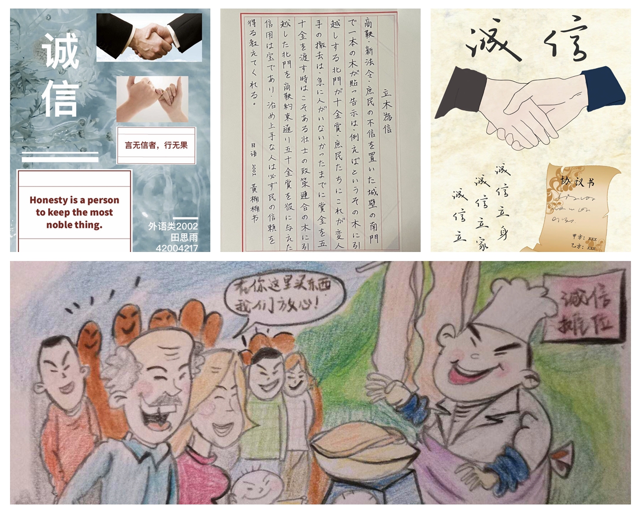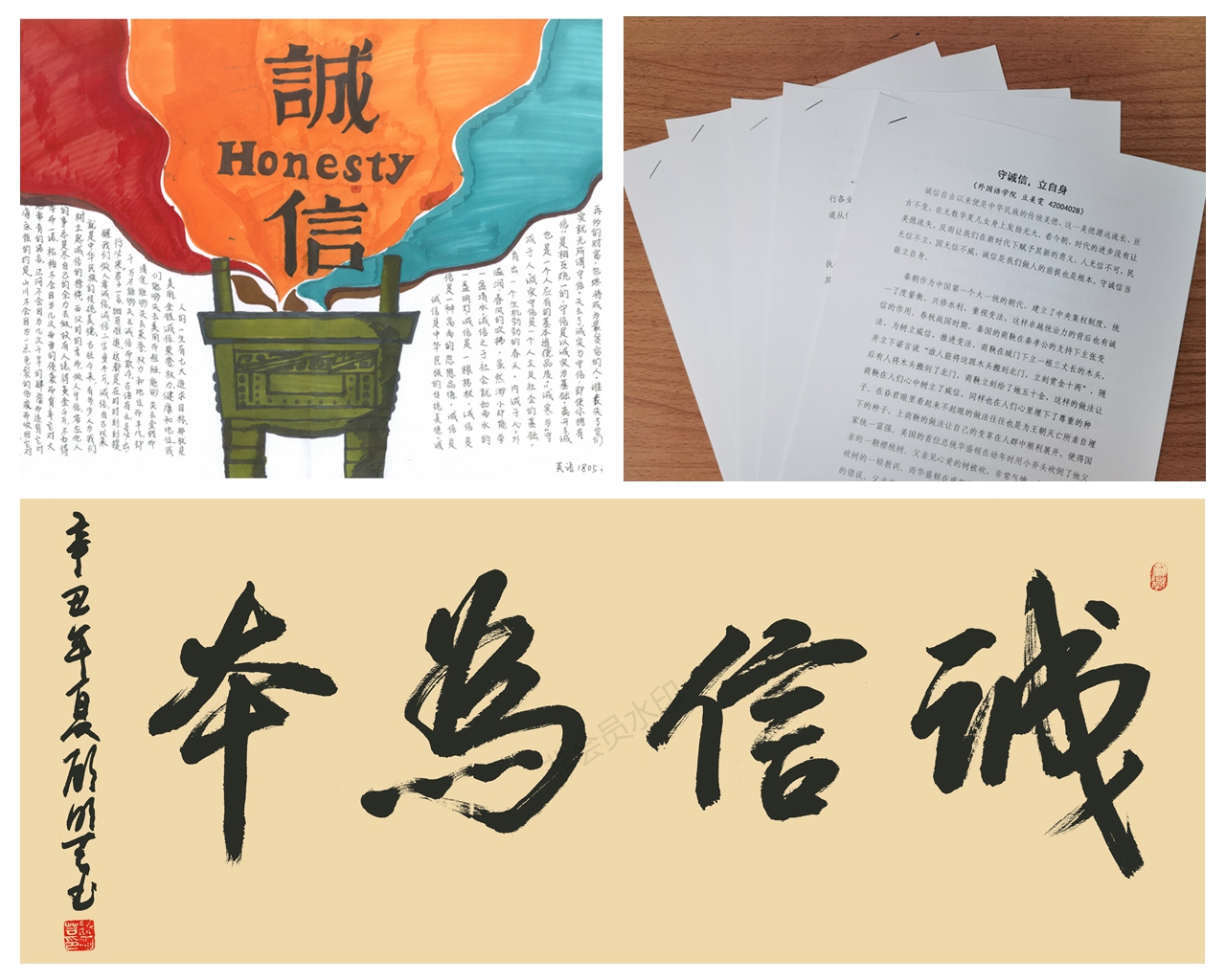 结合同学们的专业优势和个人特长,best365官方网站登录入口面向全体本科生举办诚信主题作品征集活动,拍摄微视频《诚信》讲述校园中“拾金不昧”的诚信故事——经过筛选评比,最终遴选出优秀诚信主题征文5篇,书法作品7件,手抄报绘画作品6件,主题微视频短剧1部。征文作品字里行间体现出同学们对于诚信的崇尚与呼吁,硬笔书法刚劲有力,绘画海报生动形象,短剧视频见微知著。相关优秀主题作品还在学院“语心阁”宣传展板进行展览,吸引了众多学生们前来观看。学院也通过“外院见闻”官方微信,进一步对于诚信教育优秀主题作品进行宣传展示。