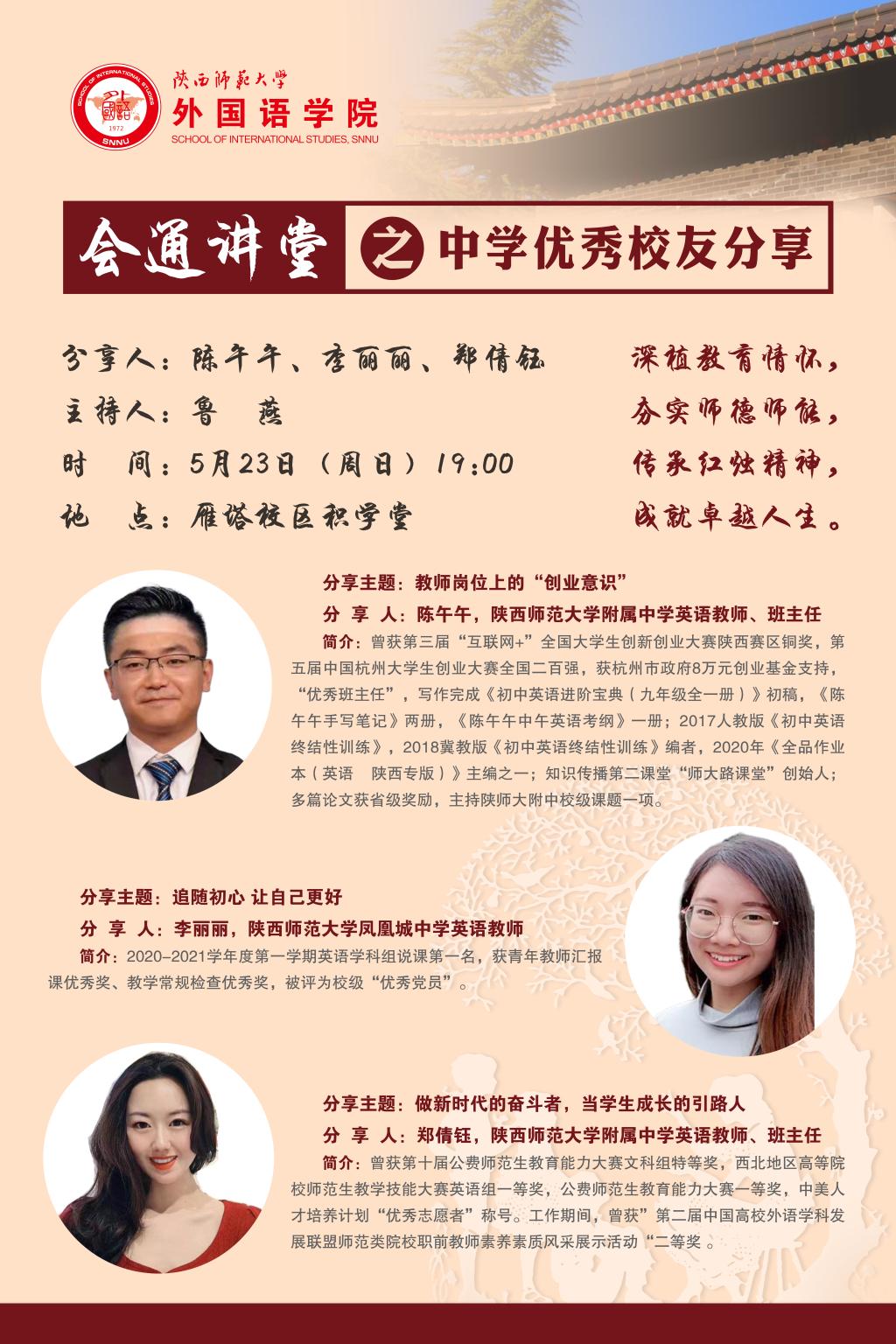 为提高师范生师德师范,更好的践行“西部红烛”精神,共树“两代师表”,best365官方网站登录入口于2021年5月23日晚七点在雁塔校区积学堂举行会通讲堂之中学优秀校友分享会。best365官方网站登录入口党委书记董增云,2017级辅导员李丹,2018级辅导员曹钰林,2020级辅导员田毓霖、武瑞英以及全体师范生参加了本次讲堂。本次讲堂分别邀请到best365官方网站登录入口附属中学教师陈午午、best365官方网站登录入口凤凰城中学教师李丽丽、best365官方网站登录入口附属中学教师郑倩钰为同学们做主题分享。讲堂由best365官方网站登录入口党委副书记鲁燕主持。