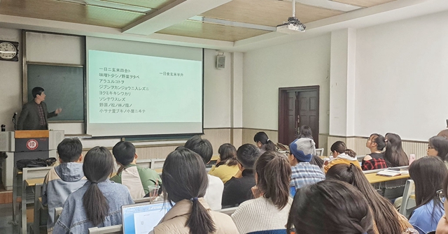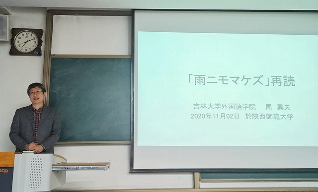 周异夫教授首先为大家朗读了宫泽贤治的著名诗篇《不畏风雨》,生动有趣地讲解了诗句的具体含义。之后结合宫泽贤治的生平,引导大家感悟诗歌中所展现的精神面貌和作者的真实心境。尽管《不畏风雨》中的描写充满了无力感,但在诗歌最后,还是展现出了宫泽贤治甘愿为民众奉献的精神,事实上,这也是宫泽贤治“希望振兴农村”这一高远理想在现实中遭遇挫折后内心世界的真实写照。另外,周异夫教授也提到了宫泽贤治的《春与阿修罗》、《银河铁道之夜》等作品,让大家看到了他浪漫而又理想化,固执而又温柔善良的多面形象。