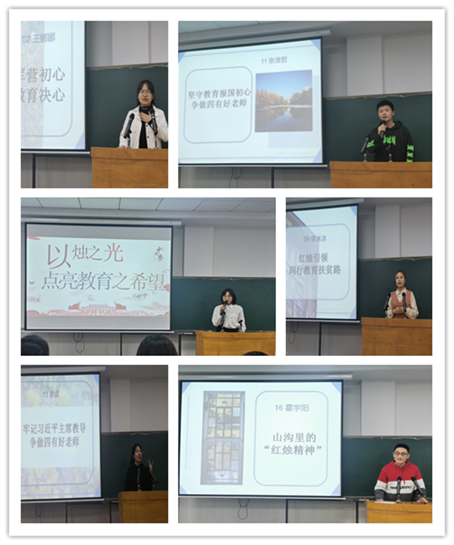 本次演讲比赛以“坚守教育报国初心,争做四有好老师”为主题,旨在贯彻落实习近平总书记关于教育的重要论述,传承弘扬“西部红烛精神”,提升师范生语言表达能力。经前期2019级师范生的全员参与,班级选拔推荐,最终共有19名选手参与本次比赛。霍宇阳同学以“山沟里的红烛精神”为题,通过分享其母亲在大学毕业后前往南泥湾的支教经历,深情阐释红烛精神的内涵,无不令现场评委和观众为之动容;徐开琳同学来自云南的山区,通过讲述高中母校的老师为教育事业无私奉献,对学生们温情关怀的故事,表达自己也要立志将“西部红烛”精神传承和弘扬的决心。