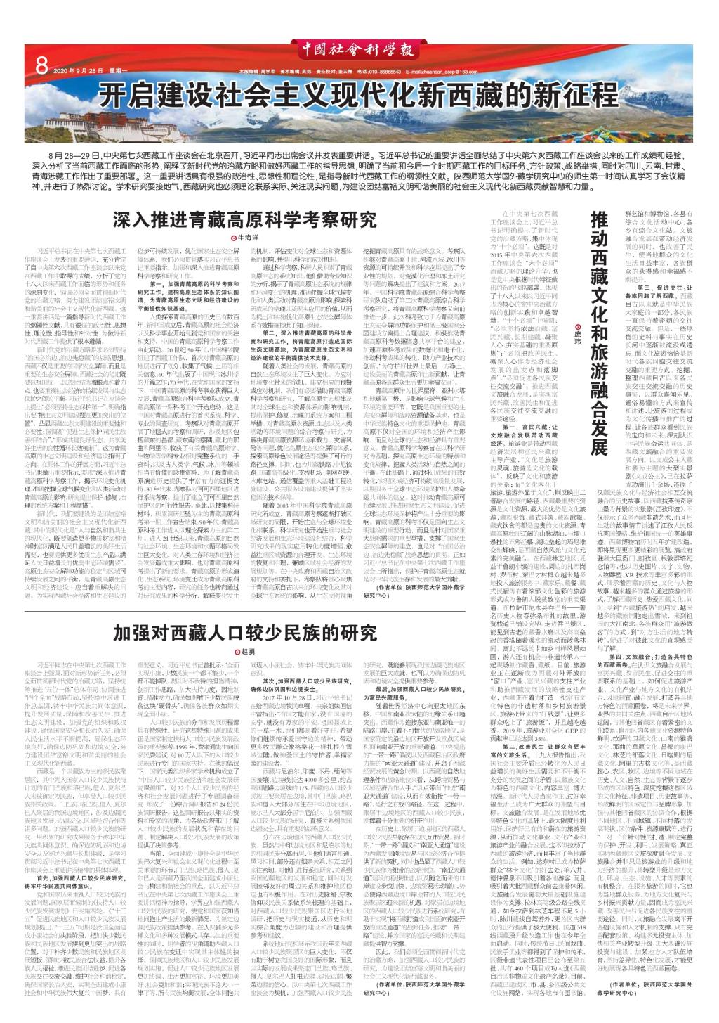 9月28日,《中国社会科学报》在第8版以“开启建设社会主义现代化新西藏的新征程”为主题,专版刊发了我校best365官方网站登录入口王启龙教授团队成员的一组署名文章。该组文章共有三篇,依次为牛海洋老师发表的《深入推进青藏高原科学考察研究》、庞玮老师发表的《推动西藏文化和旅游融合发展》以及博士生赵勇同学发表的《加强对西藏人口较少民族的研究》。