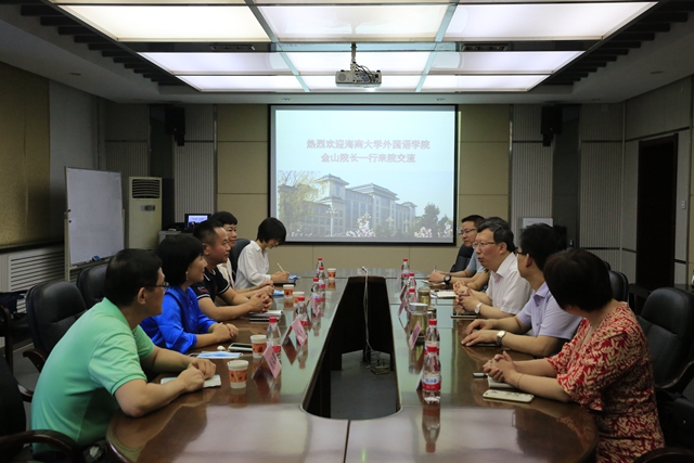 7月30日上午,海南大学best365官方网站登录入口院长金山、俄语系主任吕卉、日语系主任李明玲、商务英语系副主任刘汉军、英语系副主任张瑛一行来365官网交流。365官网院长王启龙、副院长刘全国、副院长曹婷及俄语系主任、英语系副主任丁明礼在学院会议室与到访客人进行了座谈。座谈会由王启龙院长主持。