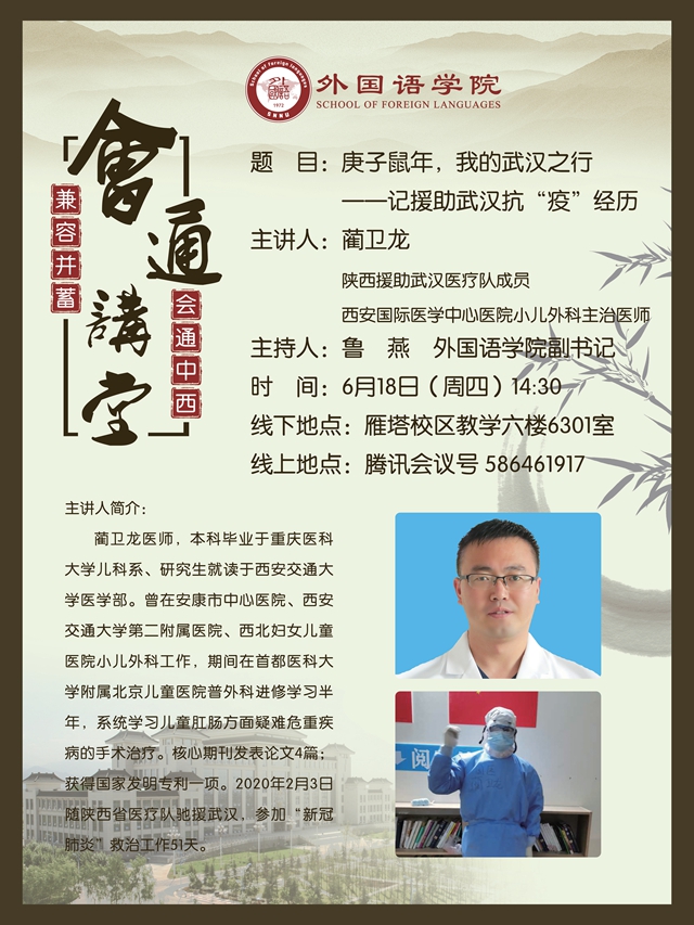 为了不断深化教职工师德师风涵养教育,进一步深入学习贯彻落实习近平总书记对疫情防控工作的重要批示指示和讲话精神,深化爱国主义教育,强化“四个自信”,6月18日下午两点半,best365官方网站登录入口特邀西安国际医学中心医院陕西援助武汉医疗队成员蔺卫龙医生在best365官方网站登录入口6301多功能厅开展“抗疫精神分享会”。三百余名师生通过线上和线下相约,一同聆听了蔺医生的抗疫故事。best365官方网站登录入口党委书记马正平出席了报告会。