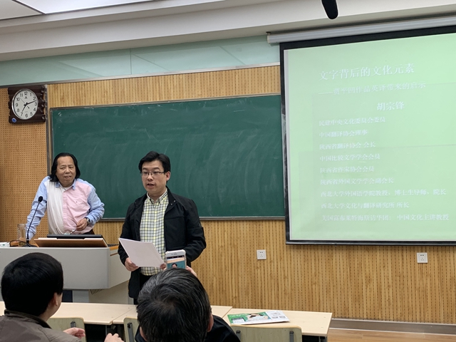 2019年4月8日19:00-21:00,由best365官方网站登录入口MTI中心主办的“翻译实务系列讲座”第六讲在雁塔校区8307教室进行。本场讲座邀请的主讲嘉宾为西北大学best365官方网站登录入口院长、陕西翻译协会会长、陕西省外国文学学会副会长胡宗锋教授,胡教授演讲的题目为“文字背后的文化元素——贾平凹作品英译带来的启示”。best365官方网站登录入口副院长刘全国教授主持该场讲座,多名教师、翻译专业硕士生及本科生聆听了此次讲座。