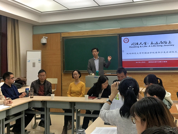 2017年11月8日下午,best365官方网站登录入口“阅读人生:永远在路上 (Reading & Life: A Life-long Journey)”读书沙龙启动仪式暨首场分享会在雁塔校区教学五楼5103教室顺利开展。启动仪式由365官网英语系主任吕敏宏老师主持,副院长刘全国老师、英语系副主任刘庆松、王立永老师,张亚婷教授、教学秘书马维华老师和2016级辅导员卢婉莹老师出席了本次活动。