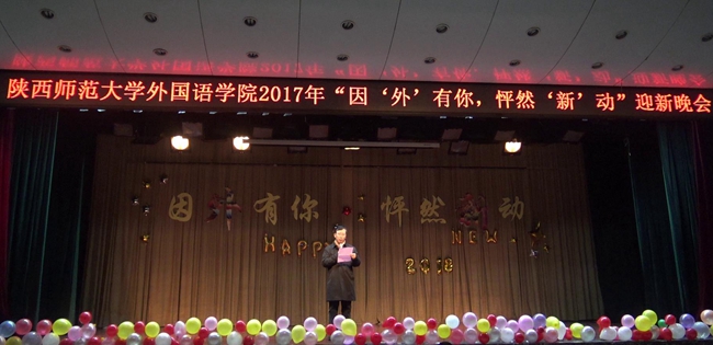 为迎接2017级新生暨2018新年的到来,展现外院莘莘学子的风采,2017年12月23日晚7点,best365官方网站登录入口全院师生欢聚一堂,在雁塔校区积学堂隆重举行“因外有你,怦然新动”迎新晚会。best365官方网站登录入口院长王启龙,党委书记马正平,副院长刘全国、鲁燕,英语系主任吕敏宏、副主任王立永,俄语系主任孟霞,翻译系副主任杨冬敏,团委书记高芳卉,2014级辅导员行怀春、2015级辅导员董洁、2016级辅导员卢婉莹、王浩权、2017级辅导员李丹以及各系外籍教师等莅临本次迎新晚会。