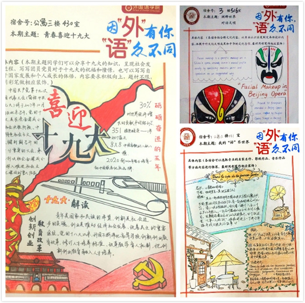 结合学风建设,best365官方网站登录入口以学生专业学习、思想交流、知识拓展、心理健康为主要内容,面向全体学生定期开展“因‘外’有你,‘语’众不同”主题门贴设计评比活动,促进学生的自我学习和沟通分享。自今年3月起,“期末总动员”、“专四备考集锦”、“定位自我,成就未来”、“沐浴春光,悦纳自我”、“毕业季,我们整装待发”、“喜迎十九大”、“全心全力,备战大学第一考”、“战胜拖延症,我们在行动”、“新时代,逢其时,有作为——学习贯彻十九大精神”、“坚定目标,勇往职前,成就青春梦想”等16期主题分享得到了同学们的积极响应。每个宿舍都参与其中,精心设计分享内容,共计1200余张。学生们通过对主题的理解、设计、分享、交流和评优,不仅强化了专业知识,同时形成了思想交流的良好氛围。