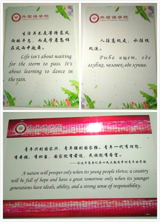 为了加强学生的思想政治教育,营造学生生活区的专业氛围,一方面,学院在学生宿舍走廊精心设计了以习近平总书记青年寄语和社会主义核心价值观为主要内容的展板。另一方面,结合专业特色和专业分布布置了中国传统文化及各国名言警句展板。所有内容均以中外文对照形式呈现,在引导学生加强思想认识的同时,帮助其树立文化自信,提升跨文化交际能力。展板覆盖best365官方网站登录入口学生所在的公寓三楼和学生宿舍六楼,共计136块。