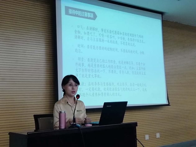 培训大会于7月4日下午在陕师大崇鋈楼思齐堂举行,博物院马灵芝老师以《走进秦始皇帝陵博物院》为题就博物院文物、外事接待礼宾礼仪、实习前期准备工作、实施工作安排以及成果展示等内容做了两小时的精心授课。并回答了同学们感兴趣的相关问题。授课期间,同学与老师积极互动,气氛活跃。培训大会由翻译系操林英老师主持。