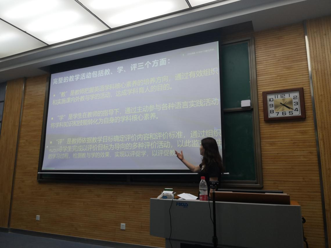 首先席燕老师从语言的建构与运用上讲解了如何在课堂上将语言能力,思维品质,学习能力,文化意识具体融入课堂。重点讲解了课堂思政和批判性思维的具体融入方式。随后席老师为同学们讲解了完整的教学活动应包括教、学、评三个方面:“教”是教师把握学科核心素养的培养方向;“学”是学生在教师的指导下,通过主动参与各种语言实践活动将学科知识和技能转化为自身的学科核心素养;“评”是教师依据教学目标确定评价内容和标准,检测教与学的成果,实现以评促学,以评促教。最后席老师强调身为教师一定要具有课程意识,将课程理念,课程内容,学生学情,教学目标,教学方式,教学评价不断细化成:为什么教,教什么,谁在学,学到什么程度,如何教学等具体模块并落到实处,落实到每一堂课,每一个教学环节。
