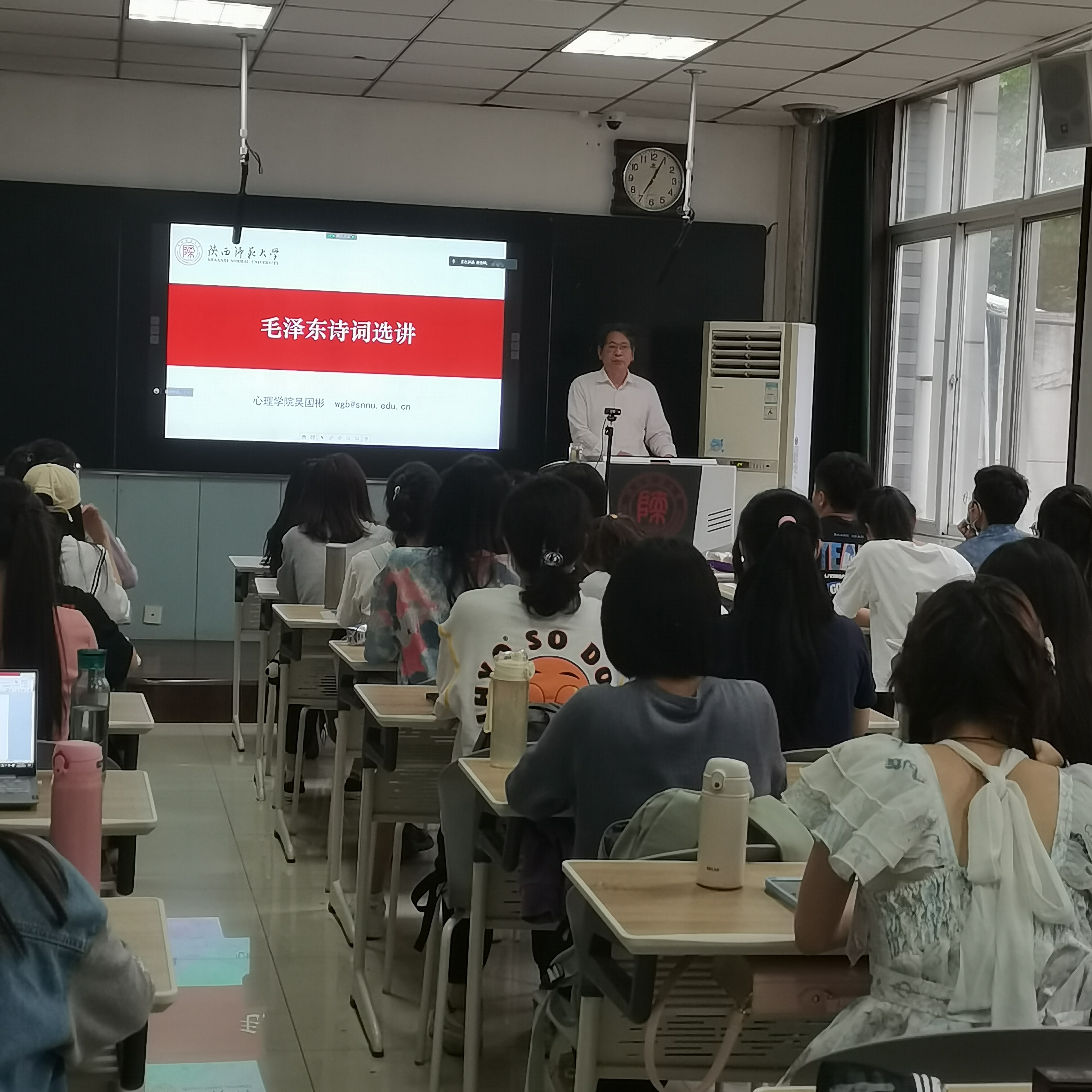 5月17日,在题为《毛泽东诗词选讲》的专题报告上,心理学院党委书记吴国彬老师通过为同学讲述伟大领袖毛泽东同志在人生的不同阶段创作的三首诗词,带领同学们领略毛主席诗词中传递的坚定的革命情怀和昂扬的革命斗志,激励同学们胸怀坚定信念,结合家国情怀,实现伟大抱负。