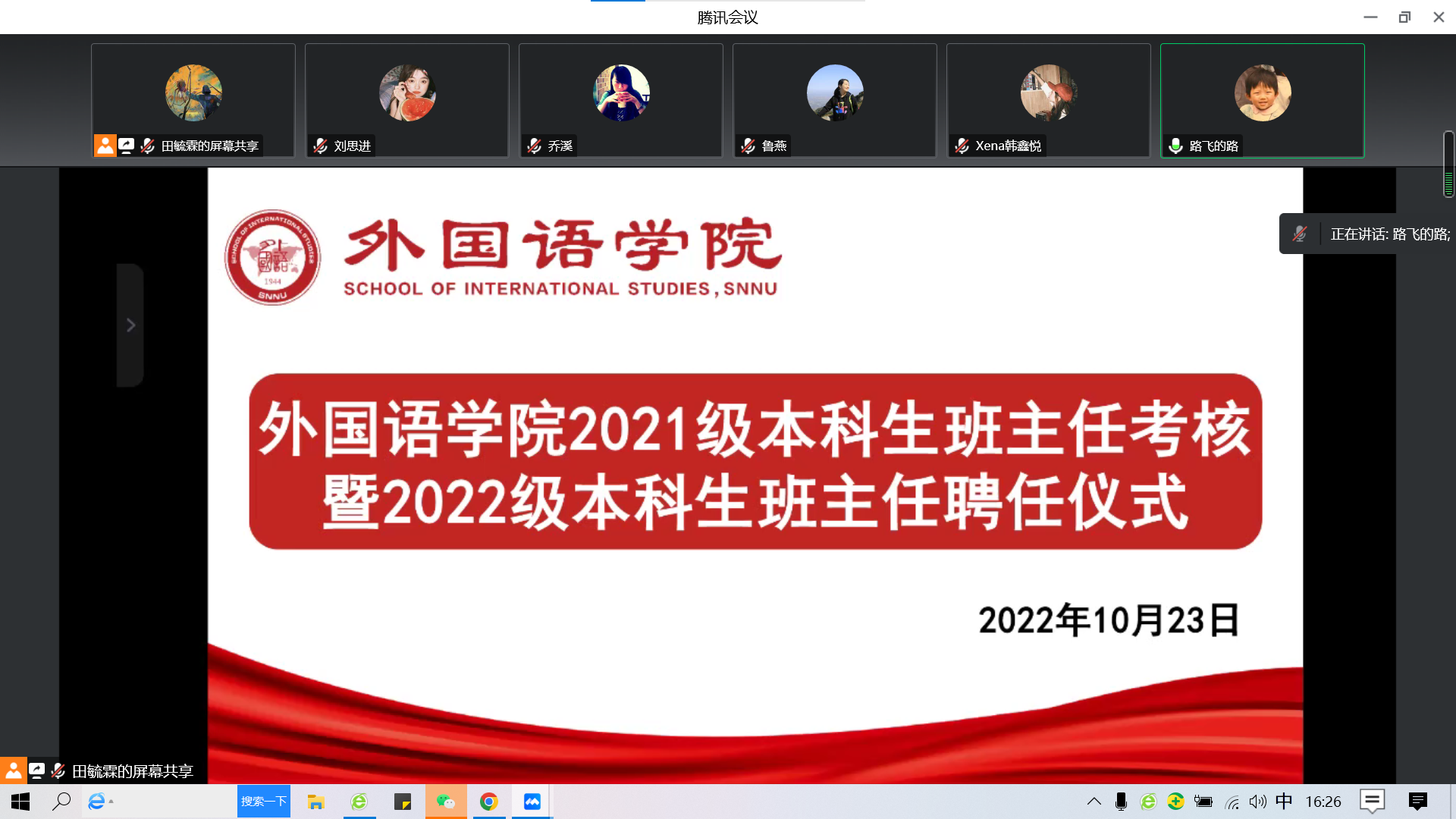 2022年10月23日下午4:00,best365官方网站登录入口通过线上会议形式召开2021级本科生班主任考核暨2022级本科生班主任聘任仪式。学院党委书记董增云、副院长孙坚、党委副书记鲁燕、2021级和2022级本科生班主任、2021级辅导员田毓霖、2022级辅导员邹胜男及2022级学生代表参加会议。会议由鲁燕主持。