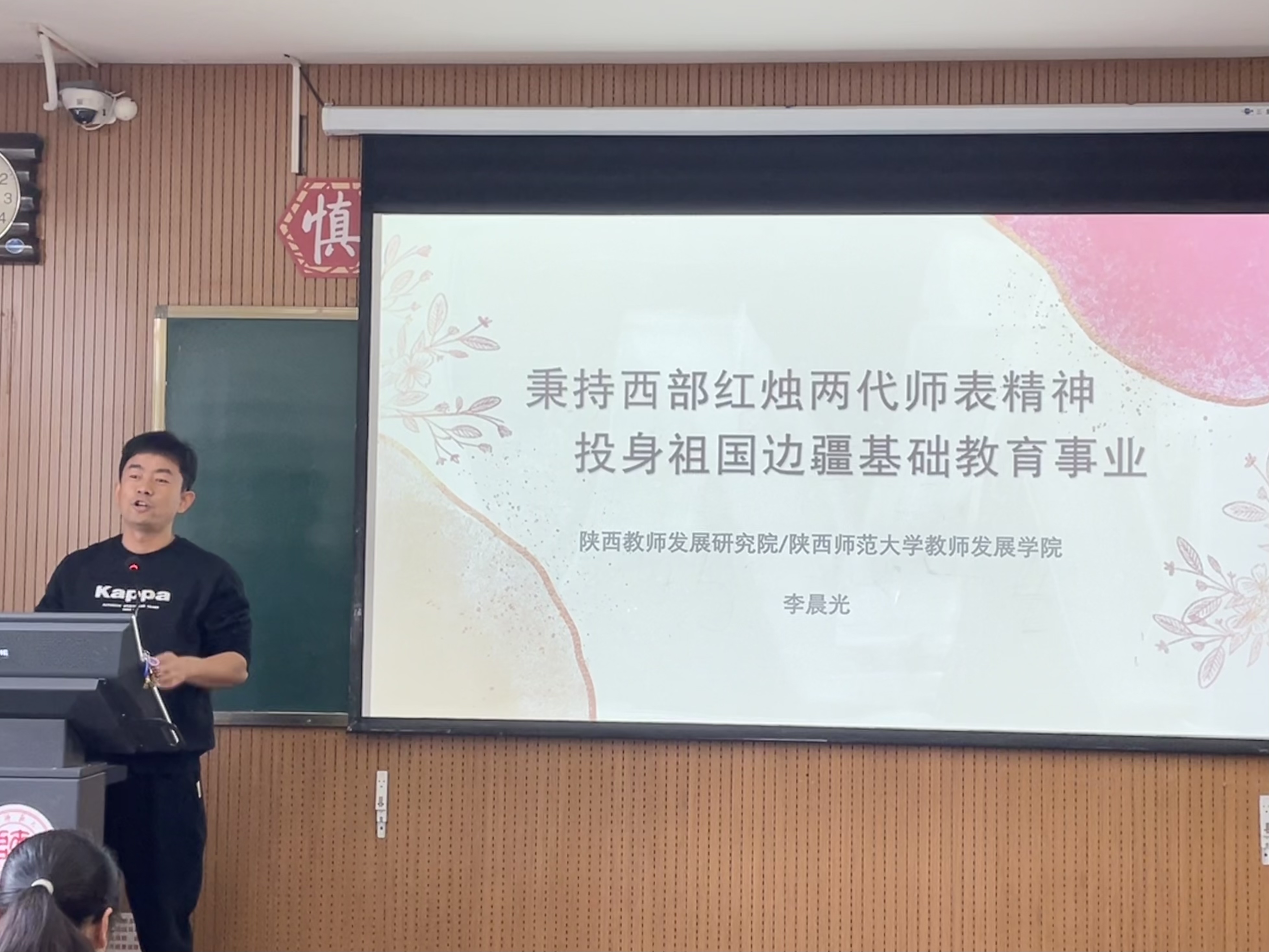 新时代教师要以杰出代表为典型,书写教育担当。李晨光老师讲述了次旺、安倩等多名陕师青年扎根西藏教书育人的先进事迹,揭示边疆基础教育现状与问题,鼓励学生积极投身祖国边疆基础教育事业,为西部教育高质量发展作出贡献。