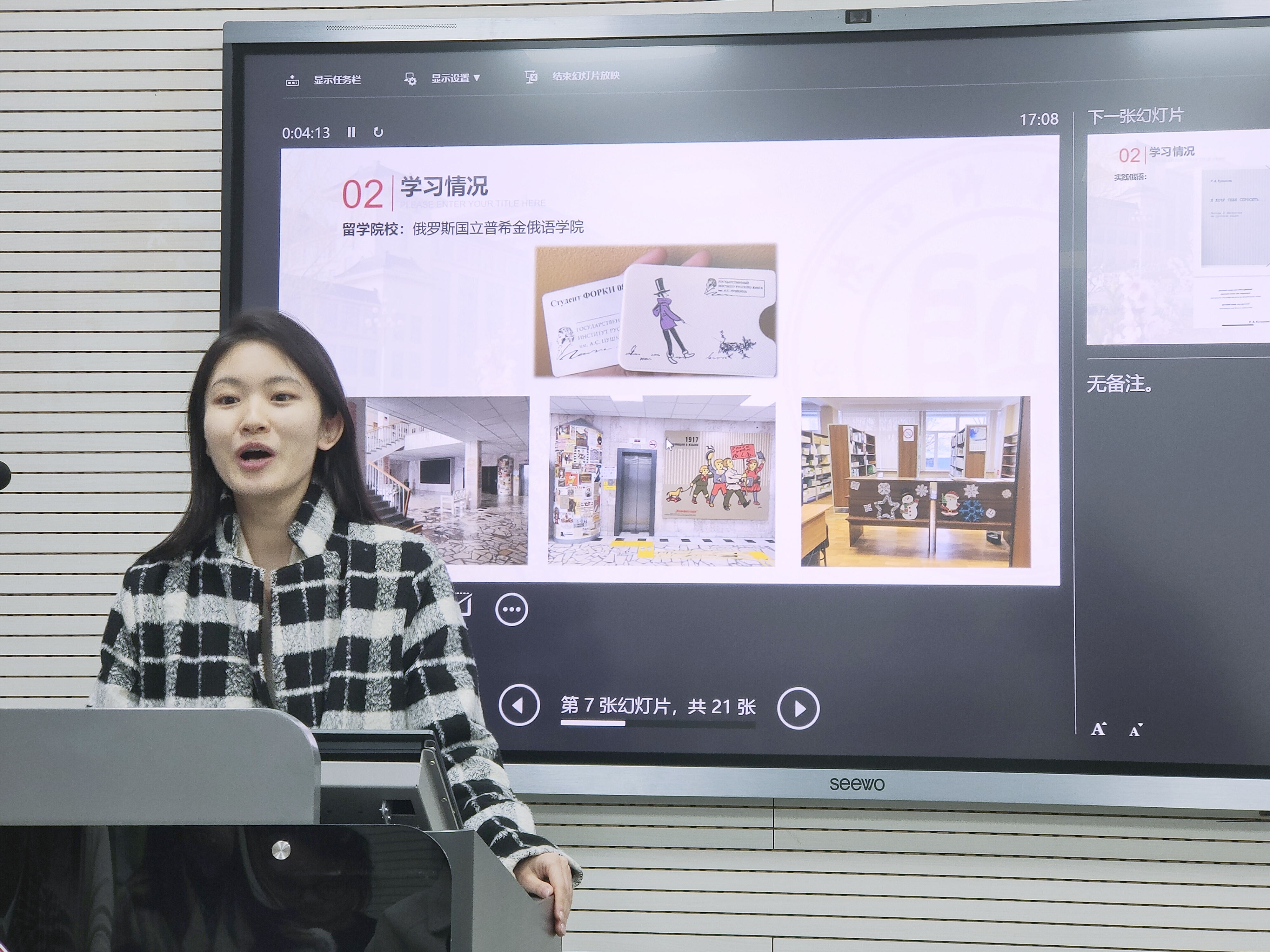 为进一步帮助best365官方网站登录入口学生了解公派留学经验,拓展专业学习的深度与广度,培养广阔的国际视野,11月23日下午,best365官方网站登录入口“博理”研究生学术沙龙第一季第5期于雁塔校区教学六楼6325教室举行。本次会议邀请365官网2021级俄语语言文学专业研究生田卓、田欣雅和2022级英语(创新实验班)本科生齐文清作分享汇报,2023级学科英语专业王乌云主持会议,365官网日语与俄语专业同学参加会议。