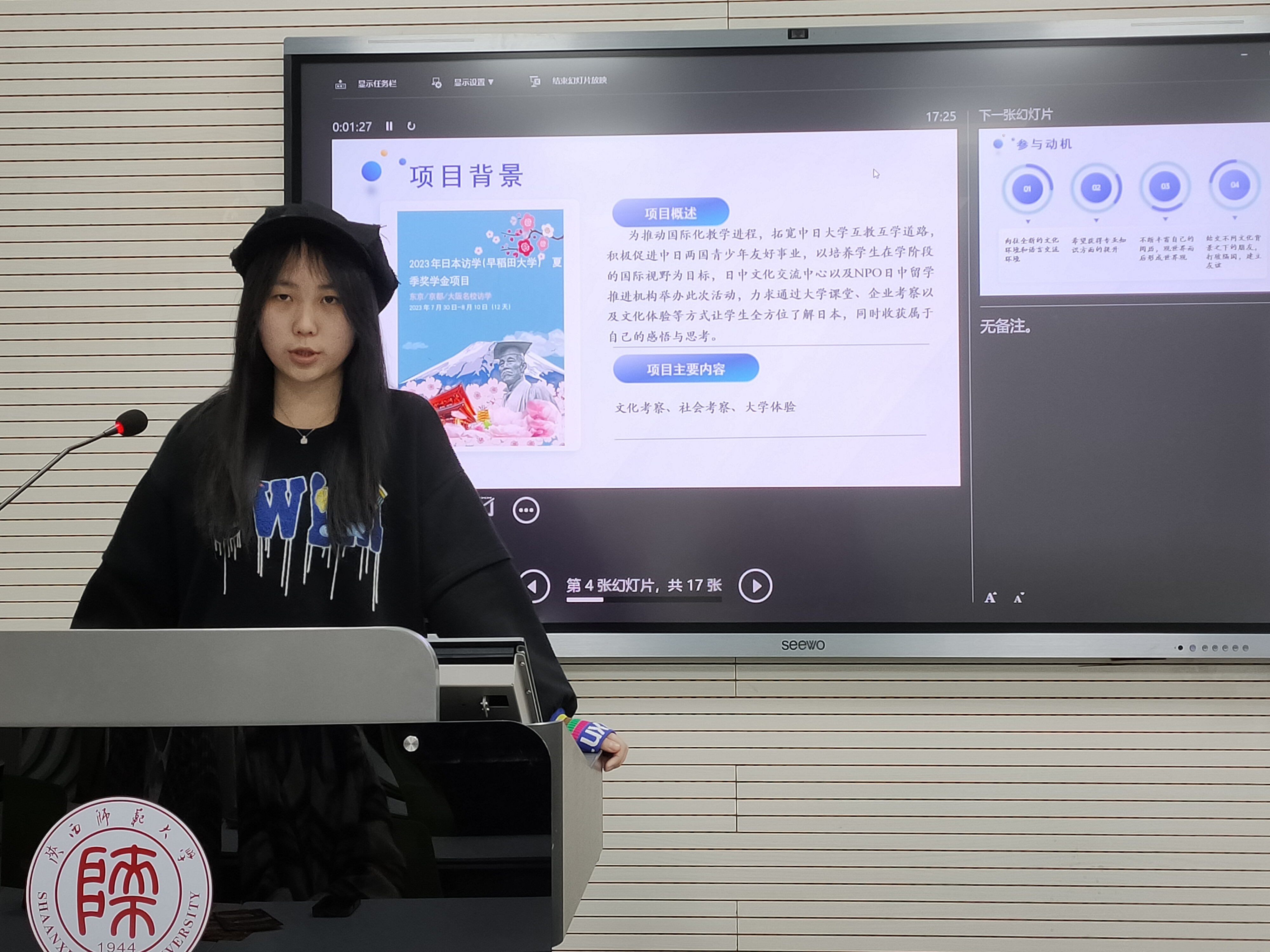 齐文清同学以《汲取知识,探索世界》为题作日本访学经历分享。齐文清同学于2023年暑假参与了日本早稻田大学夏季奖学金项目,该项目主要以文化考察、社会考察与大学体验为主,为访学者提供全新的文化环境和语言交流环境。