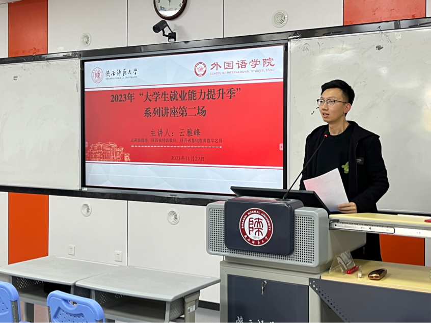 为进一步激励365官网学生就业热情,提升求职就业能力,best365官方网站登录入口于11月29日15:00在雁塔校区教学六楼6301教室举办了2023年“大学生就业能力提升季”系列讲座的第二场报告会。365官网院友、正高级教师、陕西省特级教师、陕西省基础教育名师云雅峰受邀主讲了主题为“带着爱与梦想,在追光之路上成为最好的自己”的讲座,365官网2024届毕业本科生和研究生积极参加本次讲座。本次讲座由毕业班辅导员高宇轩主持。