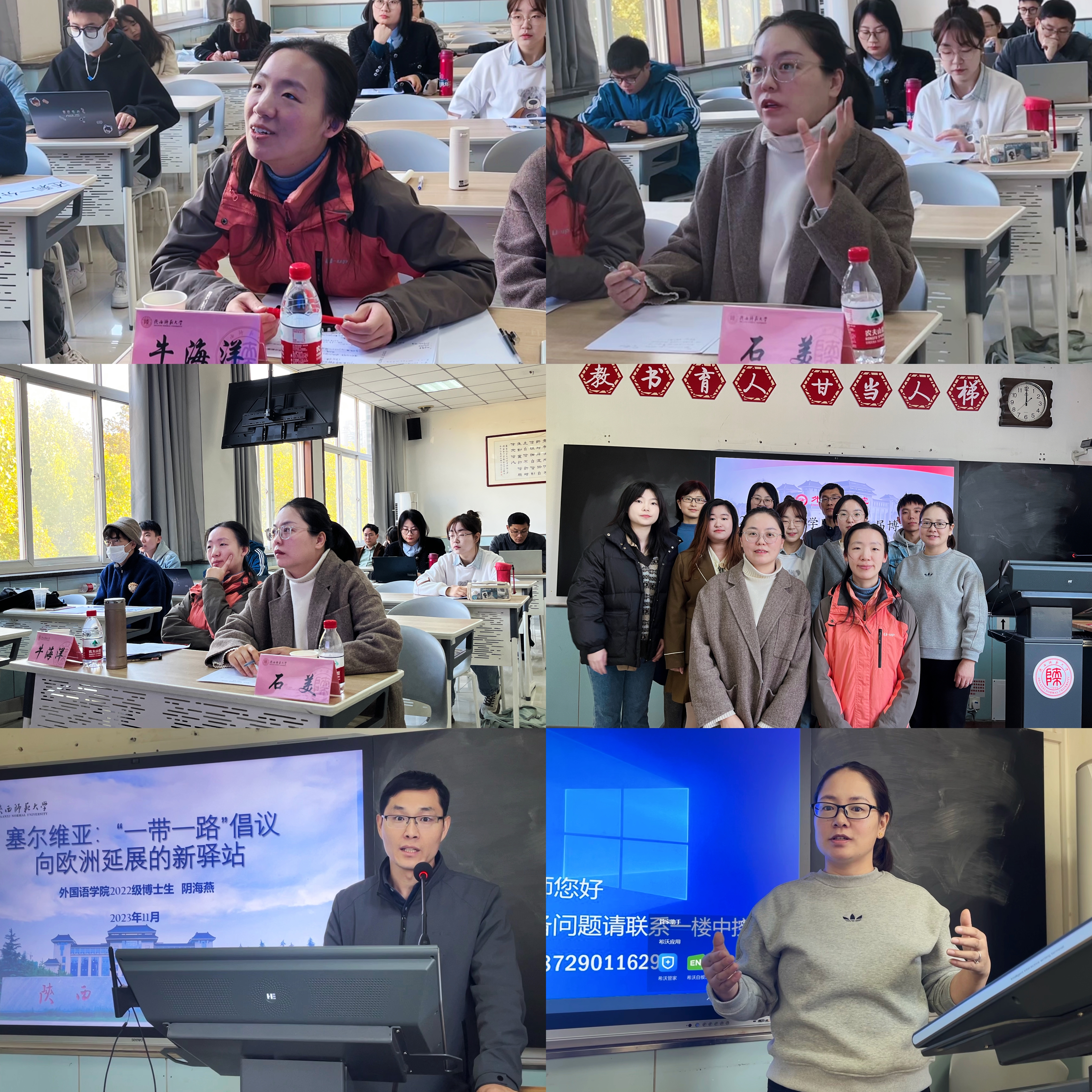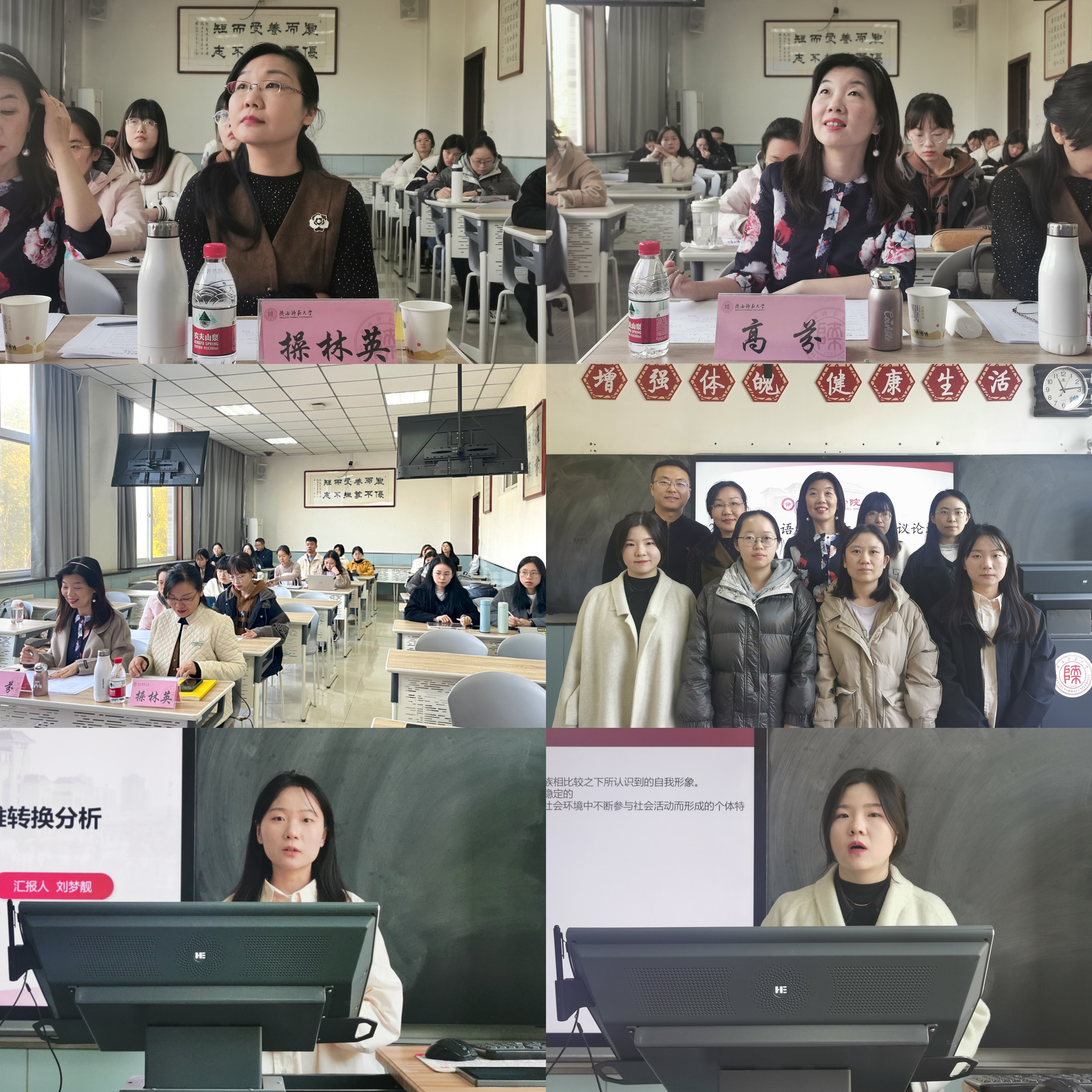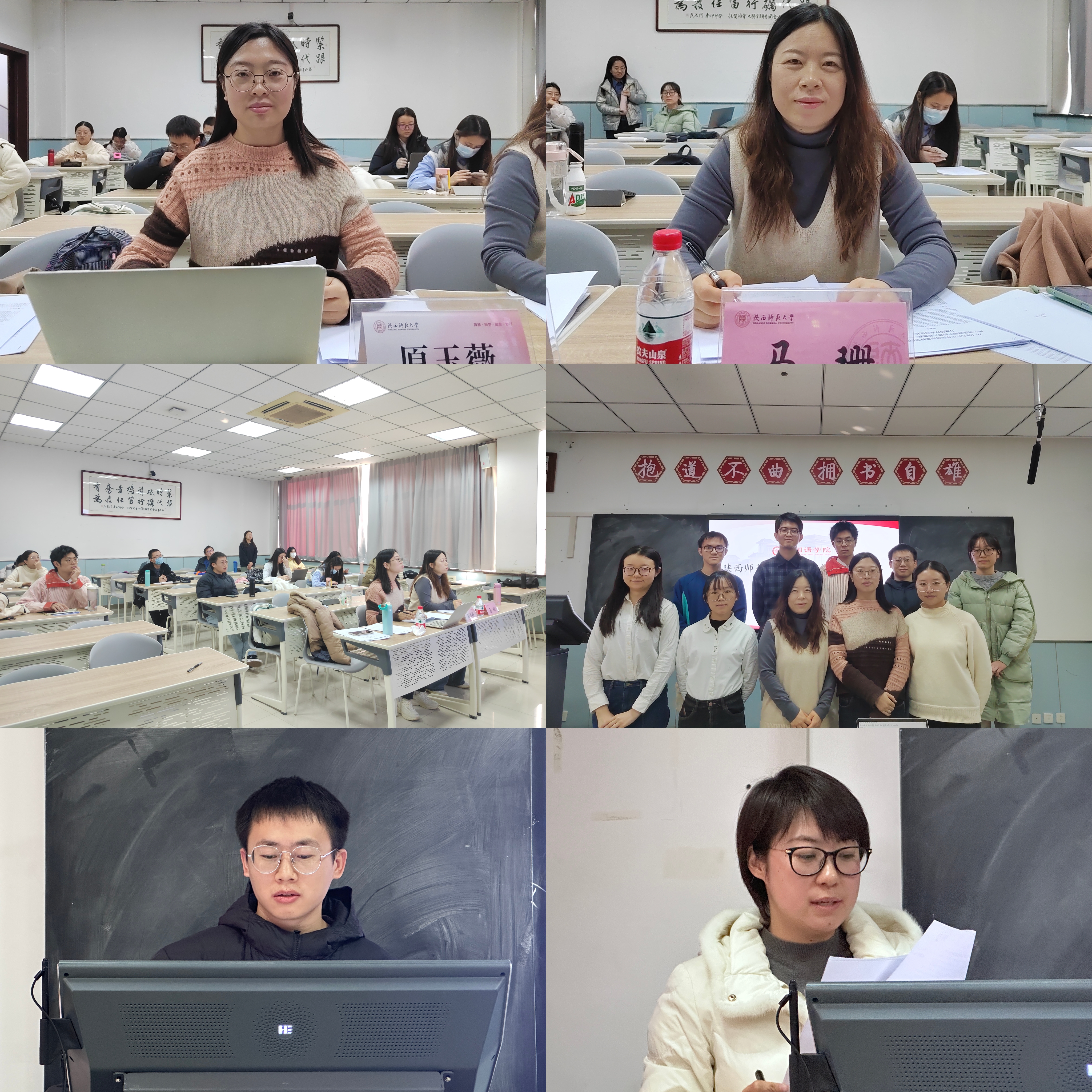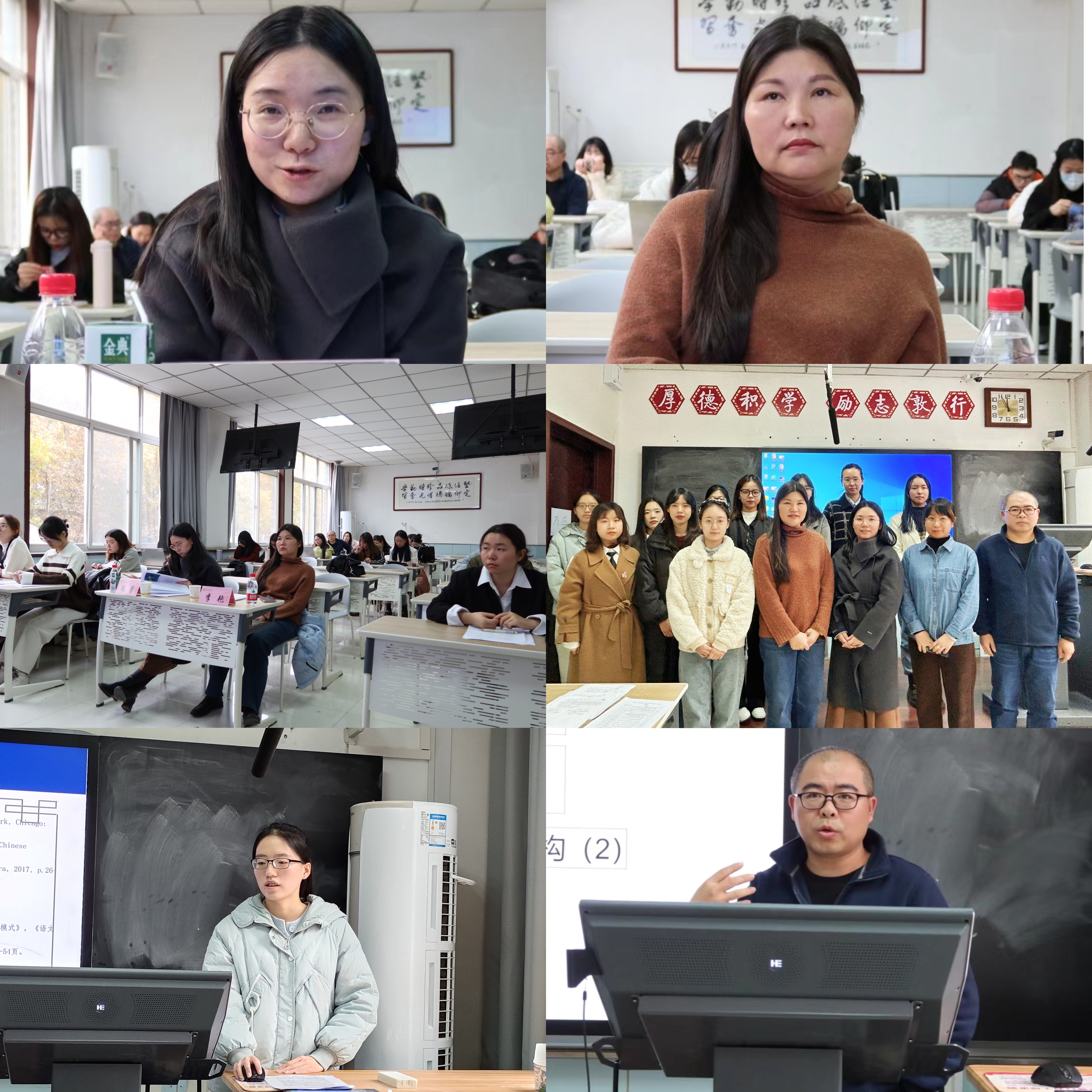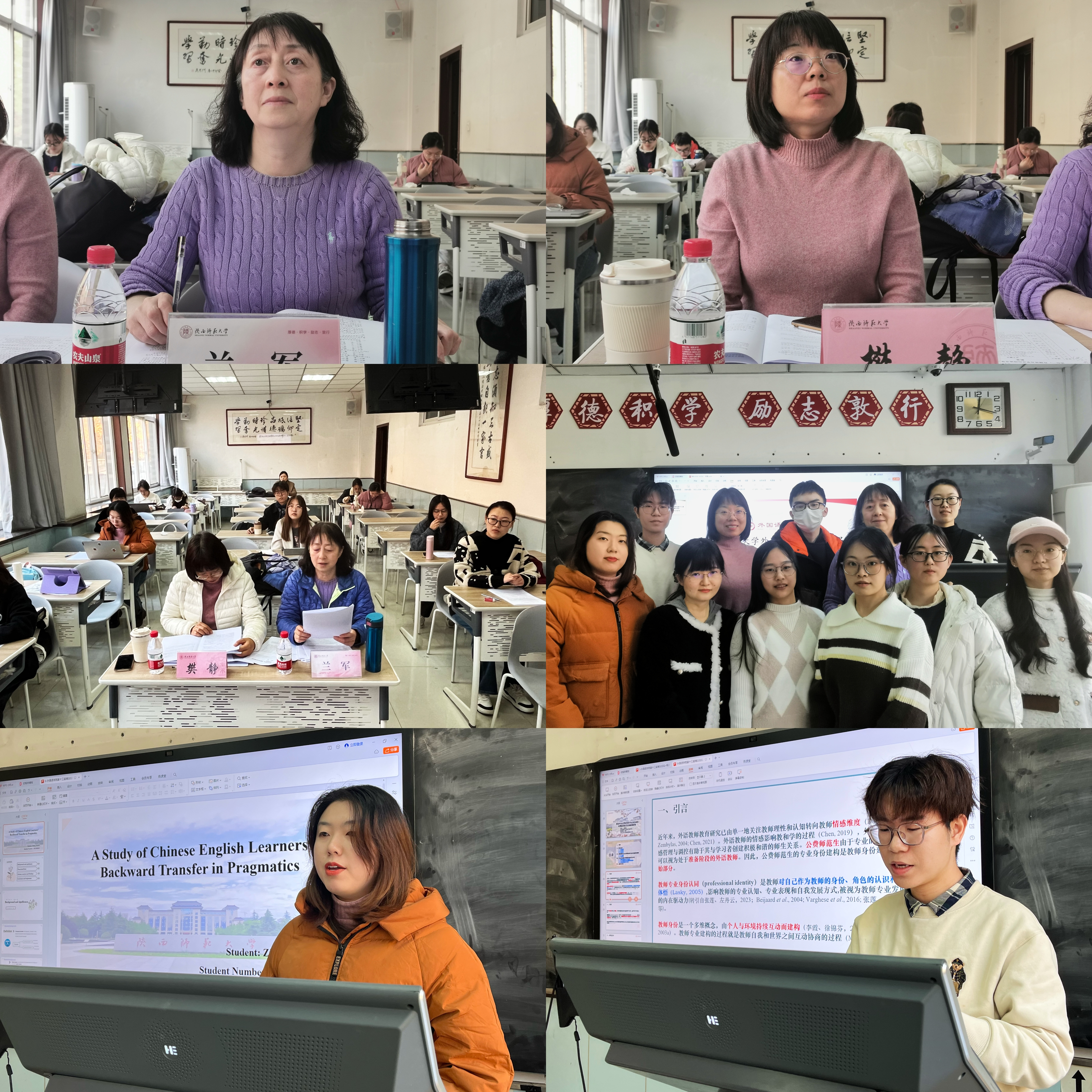 十名同学从多个主题出发进行了汇报。本科生廖一力、杨家硕、杨家硕与祝捷分别以“关中与陕北地区学生学习日语语言可能出现的语言迁移现象”“英语专业公费师范生专业身份构建和情感体验交互的叙事研究”“‘大单元—过程体裁’教学新理念:阅读和写作教学的互动研究”为题进行讲述。硕士生董雪冉、刘彦媛、张昕冉、张一菊、钟晓琳、周彤、张燕堃分别以“‘X有自己的Y’的构式演变及认知阐释”“词语符号性视域下‘丝绸之路’语言学命名的研究”“The Study of Chinese English Learners’ Backward Transfer in Pragmatics”“基于核心素养的初中英语反思性教学个案研究”“在线语料库资源对英语写作表现影响研究(Study on the Effects of Online Concordancer on L2 Writing Performance)” “Effects of ‘Internet Plus Education’ on English Major’s Listening and Speaking Proficiency” “A Study of English Majors’ Cognitive Style, Grammar Learning Anxiety and Grammar Learning Achievements—An Example of Beijing University of Chemical Technology” 为题进行分享。博士生王颖平以《华州方言文白异读研究》为题进行讲述。两位评委老师各抒己见、细致点评,指出了同学们论文研究方法、行文结构等方面存在的问题,并提出了宝贵的意见与建议。
