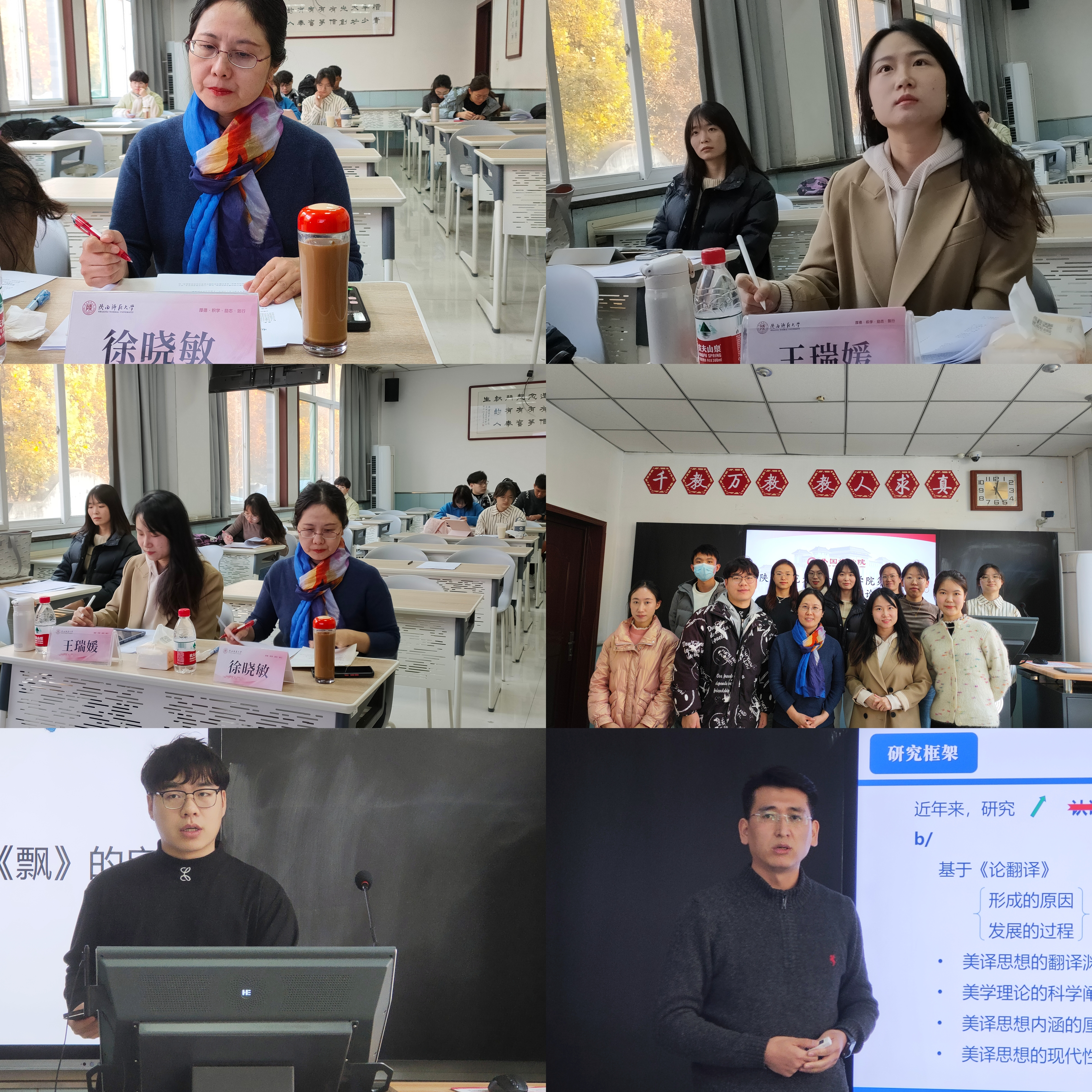 八名同学先后从不同角度做了研究汇报。本科生侯奕彤以“交际翻译视角下的汉英语言景观建设情况与思考——以陕西省西安市大慈恩寺和大兴善寺为例”为题进行汇报。硕士生张雪香、张亚楠、朱剑峰、郭英、许怀民分别以“《许三观卖血记》中前景化语言的英译策略研究”“文本类型论对传记文学翻译的指导——以 Augustus:The Life and Tims of the Founder of the Roman Empire(节选)汉译为例”“建筑工程翻译译者行为批评分析——以项目翻译为例”“苏轼词作译者群体行为批评分析——以《念奴娇·赤壁怀古》英译本为例”“语境文化理论视阈下中西方委婉语文化内涵的对比研究”为题汇报。博士生关相东、李文玉则以“旧论新释:鲁迅翻译思想的现代性发微与开拓”“理雅各《中国经典》副文本的批评话语分析”为题进行汇报。两位评委老师高度肯定了每位汇报人的学术精神,并就论文中出现的格式与内容问题提出了修改意见。