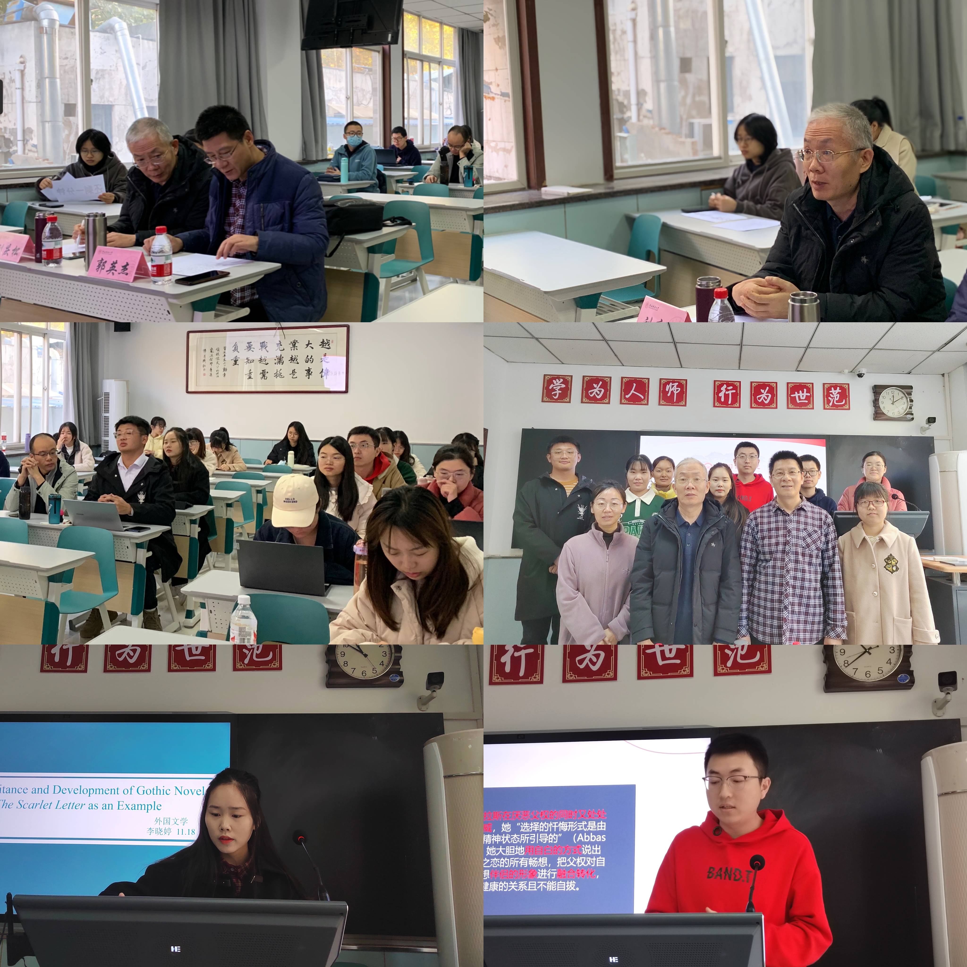 本科生陈俊喆、艾俊澎和杜悦悦分别以“加缪《鼠疫》中的荒诞与反抗”“从圣愚角度观察《死屋手记》中陀思妥耶夫斯基的拯救心理”“英雄与反英雄:《失乐园》中的撒旦与《卡门》中的卡门形象比较分析”为题进行了详细讲解。硕士生封彩、郭雯婷、李明骏、李晓婷和马和艺分别从“坚守、出逃、回归:浅析《爱药》中的印第安男性形象”“福柯权利理论视角下《小城畸人》畸人形象解读”“诗中的幻影:《爹爹》中普拉斯的身份想象”“Hawthorne’s Inheritance and Development of Gothic Novels: Taking The Scarlet Letter as an Example”“The Analysis of Lord of Flies from the Perspective of Eco-feminism”主题出发探讨了不同方面的文学书写。博士生侯崇莹和王梦鸽分别以“利德盖特《攻占底比斯》中的劝慰词书写”“Hoccleve’s Manipulation of Insane Memory for His Self-Fashioning in the Series”为题讲述了中世纪文学。两位评委老师全程认真聆听记录,对每位同学的发言进行了点评。
