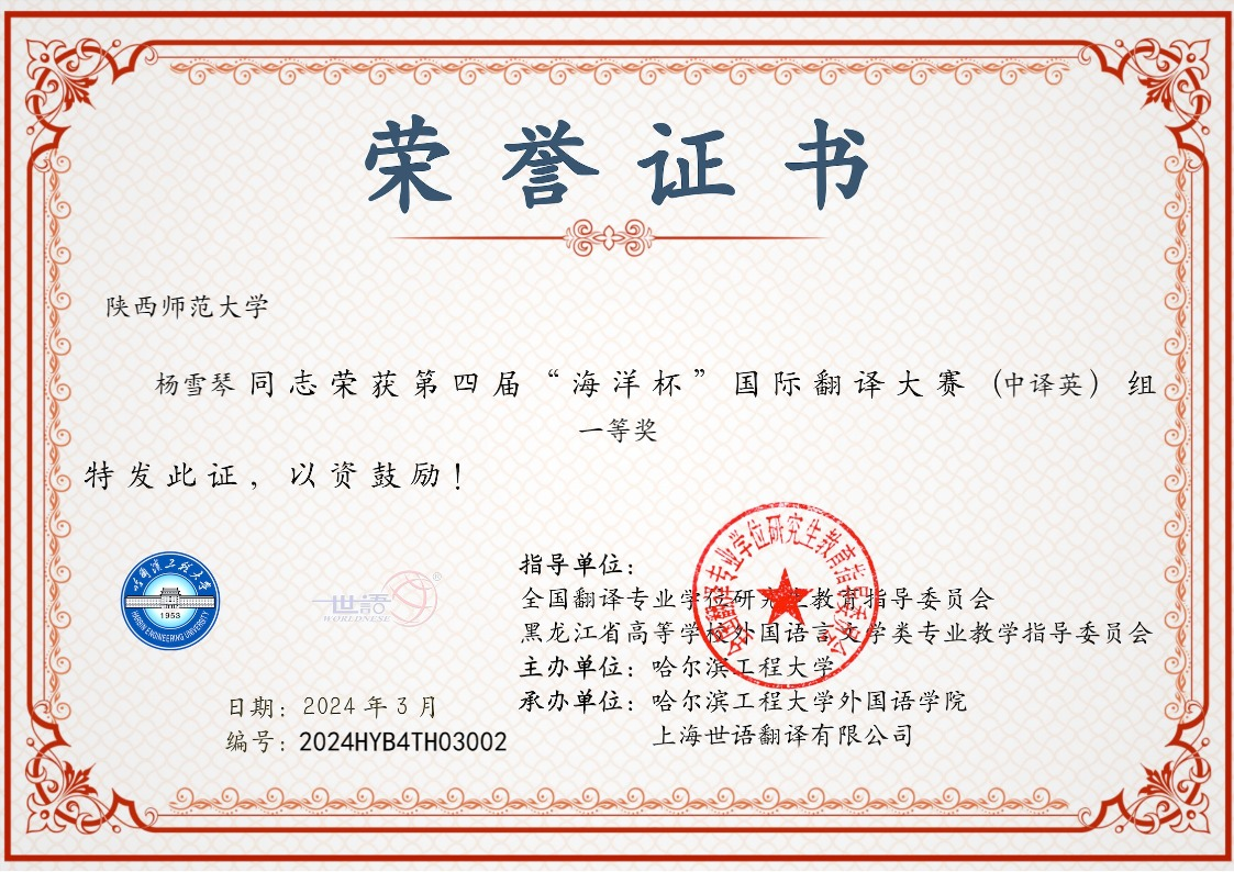 2024年3月14日,第四届“海洋杯”国际翻译大赛获奖结果公布,365官网研究生获得中译英组一等奖。